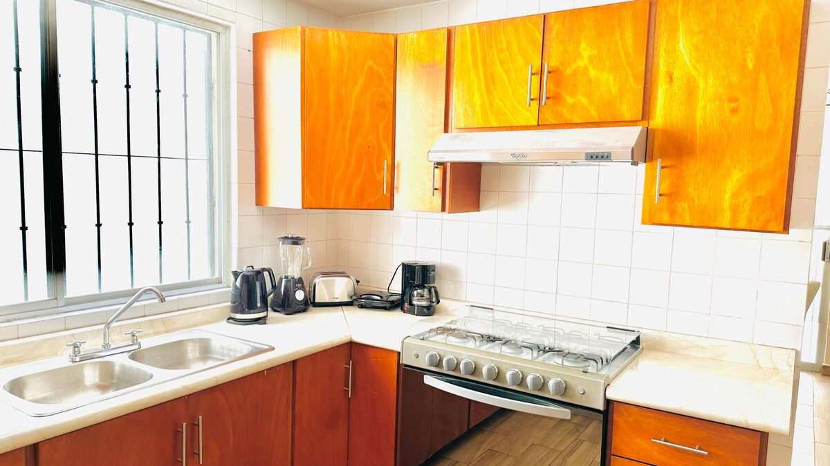 Beautiful apartment with a family atmosphere and a modern and cozy style! An excellent option to rest and enjoy. 100% equipped, high-end bedding, pillows and mattresses to offer maximum comfort and rest. It has a full kitchen, stove, oven, refrigerator, microwave, and blender. Excellent location in front of industrial and student area. Close to major shopping malls, 20 minutes from the airport, 8 km from Parque Fundidora, Cintermex and downtown Monterrey.