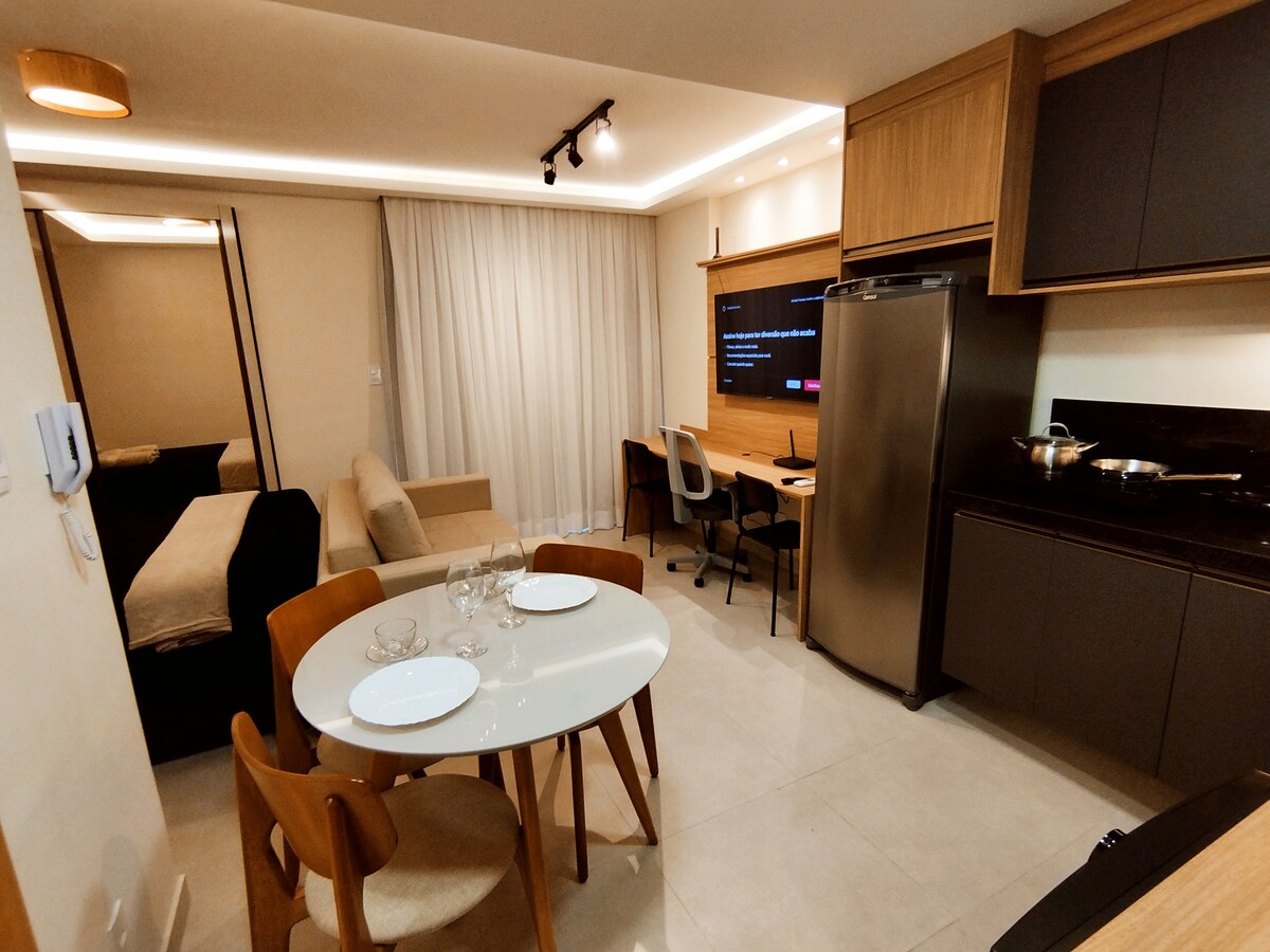 New Studio apartment with garage. All new furniture and designed to bring maximum comfort to our guests. Very well located with everything close by, in the middle of Av. Itamar Franco, almost on the corner of Av. Br. Rio Branco in the heart of the city! Ideal for your home office combined with leisure! With a complete leisure area with swimming pool, fitness center, gourmet area, coworking, kids space and laundry. Enjoy an unparalleled experience in this well-located Studio with a garage!!