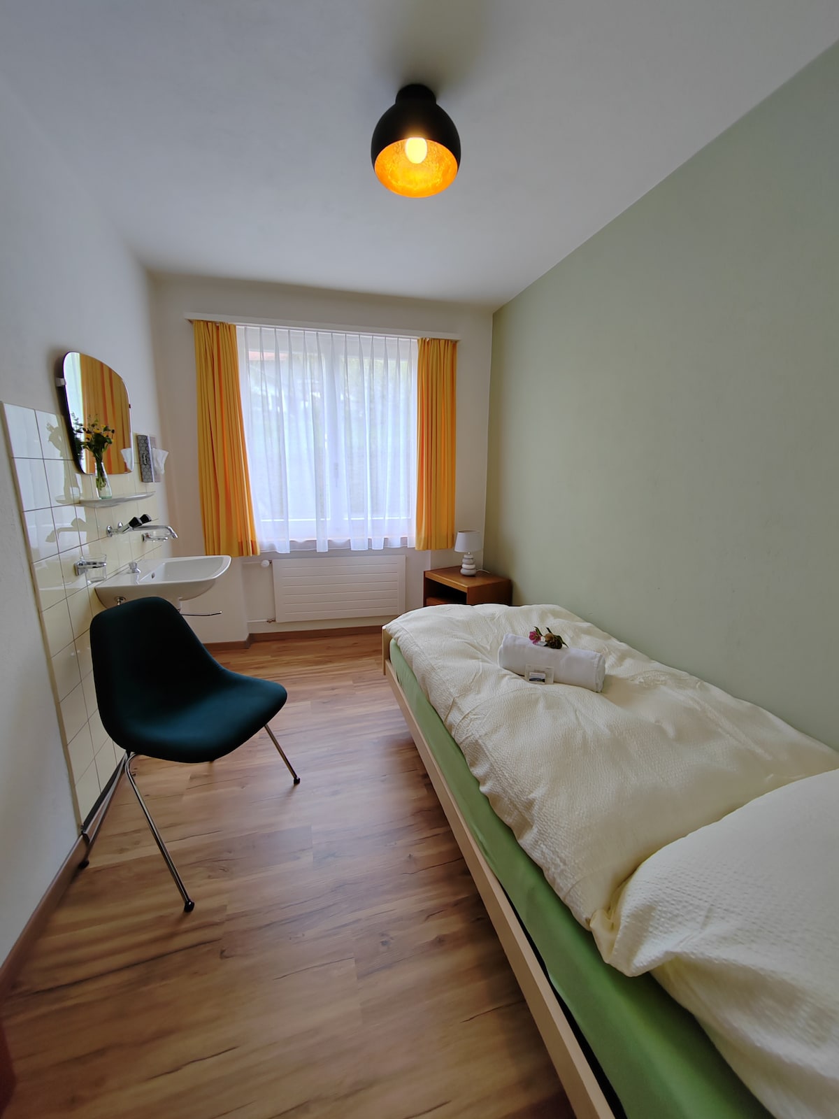 The small single room is furnished with 1 bed, and has a sink with running water. No space for a toddler bed. Bed and terry towels are included in the room price. The room does not have its own toilet and shower! Toilet and shower for shared use are located on the respective floors.