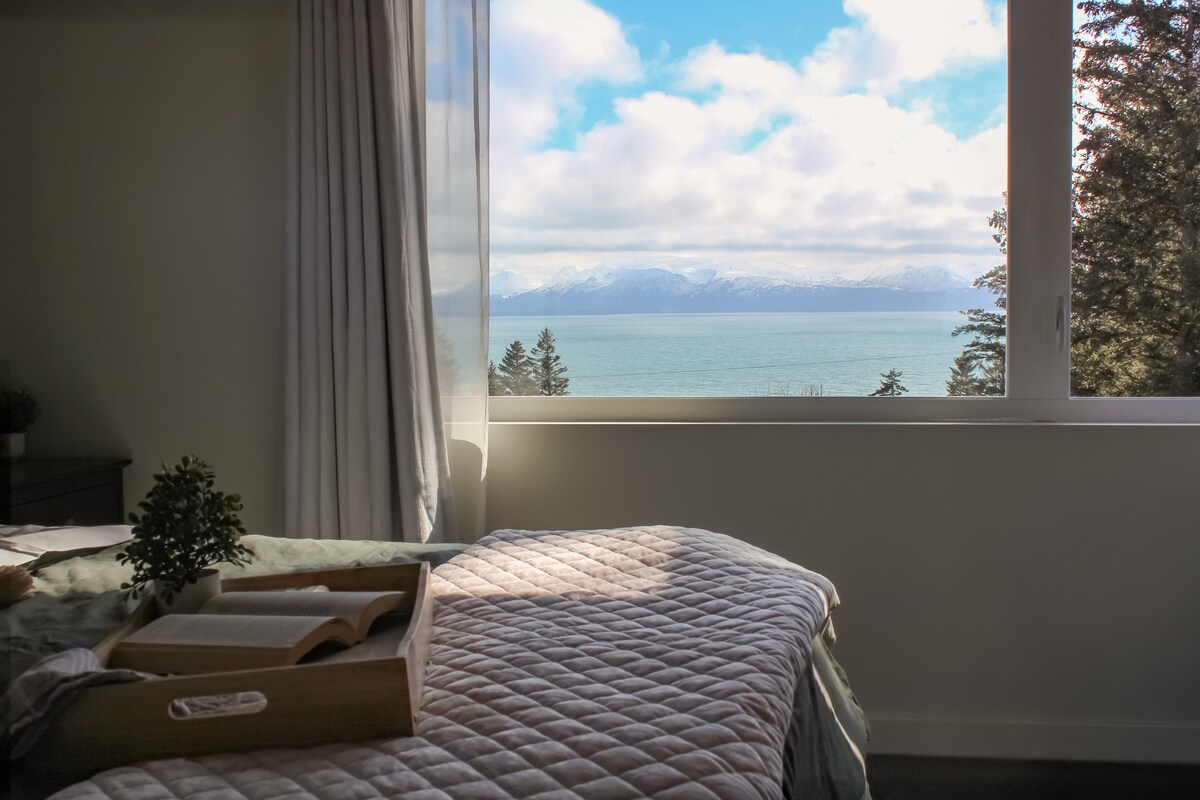 Enjoy a beautiful lake and mountain view in modern style! Relax in our luxurious spa-like bathroom with soaking tub, two shower heads, and heated floors, and enjoy cooking in our unique retro kitchen. Only 2.5 miles to the famous Homer Spit and minutes from all amenities, galleries, breweries, charters, hockey rink, and the airport.