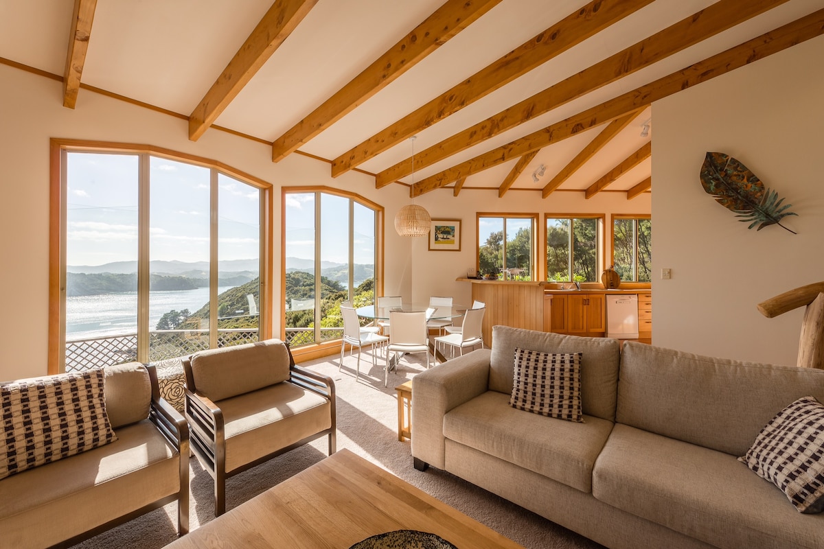 Tranquil and private, a beautiful Macrocapa post and beam house overlooking the gorgeous Kerikeri Inlet. A haven for relaxation surrounded by native birds, including kiwis, tuis, fantails and wood pigeons, all living on the property. Enjoy a wine on the veranda and watch the boats go by or take a swim at Opito bay- just 5 minutes away. Plenty of room to park the boat plus two launching ramps, a ski lane and some of the best fishing NZ has to offer!