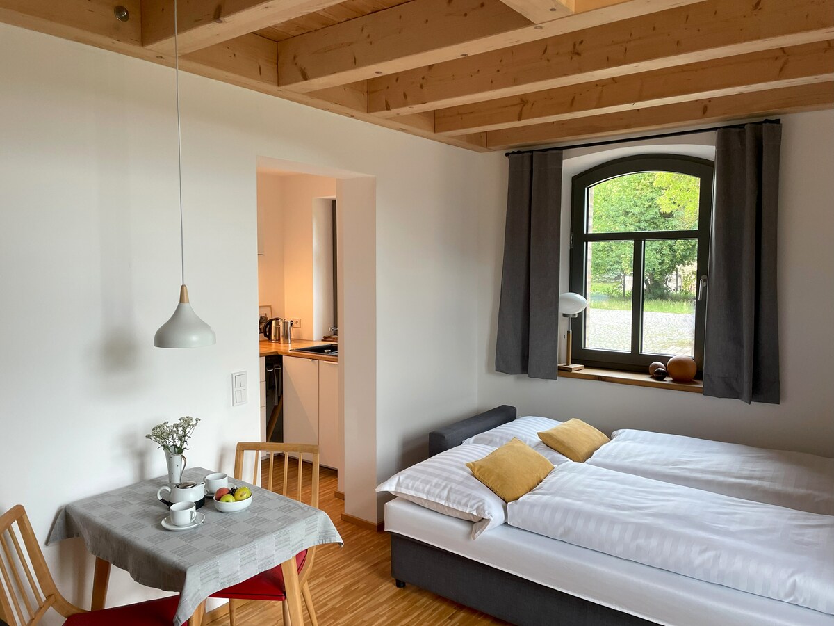 In the middle of a farm with picturesque charm, your will find enough space and peace in a large, loft-like studio to switch off undisturbed and relaxed, make new plans or meet friends. From here you can visit the sights of the nearby Wettiner Land, swim in the Seekreis, or discover the magic of the terminal moraine on the great hiking trails.