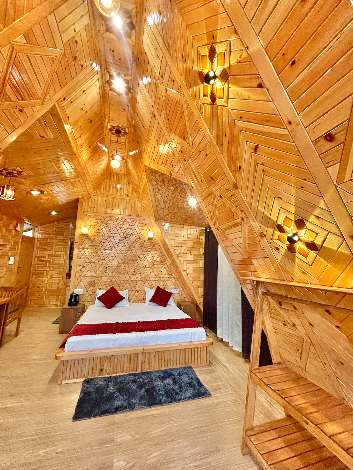 Glamoreo, just 1 hour away from Shimla. Stunning walnut wood interior, including all the furniture. Outdoor wooden bathtub, perfect for soaking in the fresh mountain air. The surrounding area is open and spacious. You can walk around, take in the scenic views, and get a feel for rural life. Everything here is organic, from food to dairy products. If you don’t feel like home-cooked meals, there are cafes and restaurants just 3–4 km away, and you can either visit them or have food delivered