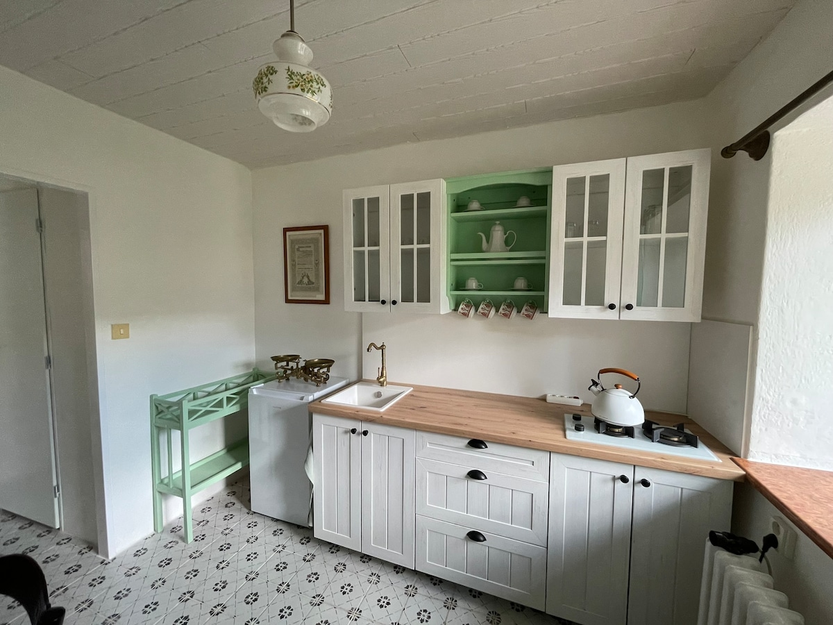 The apartment offers a pleasant stay for those who welcome peace and quiet. It is in a beautiful and peaceful nature a short distance from the forest, surrounded by meadows. The accommodation will welcome nature lovers, mushroom pickers, dog lovers, families with children, cyclists, skiers and romantics. The apartment is furnished as a separate unit, tastefully and with elements of history. It is rented all year round. The apartment includes a garden where you can spend a pleasant evening by the fire, roast sausages, listen to birds singing, or have a morning coffee and a good breakfast under the pergola.