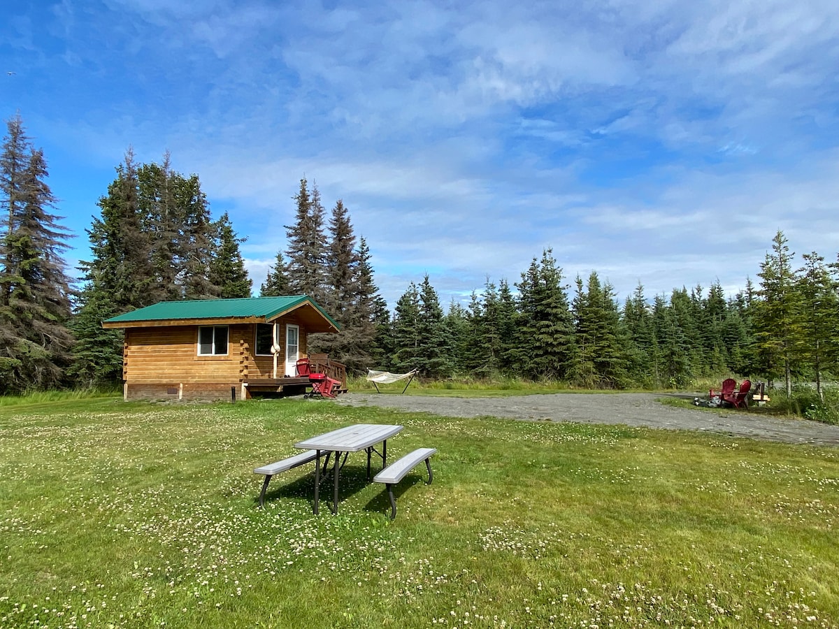 One room cabin is close to town and shopping but located directly between the Kenai and Kasilof rivers and 30 minutes from Deep Creek Halibut fishing. This private cabin sits at the end of a cul-de-sac in a small, dog friendly neighborhood with Alaska's wilderness at it's back. No smoking. Pets welcome. RV parking upon request