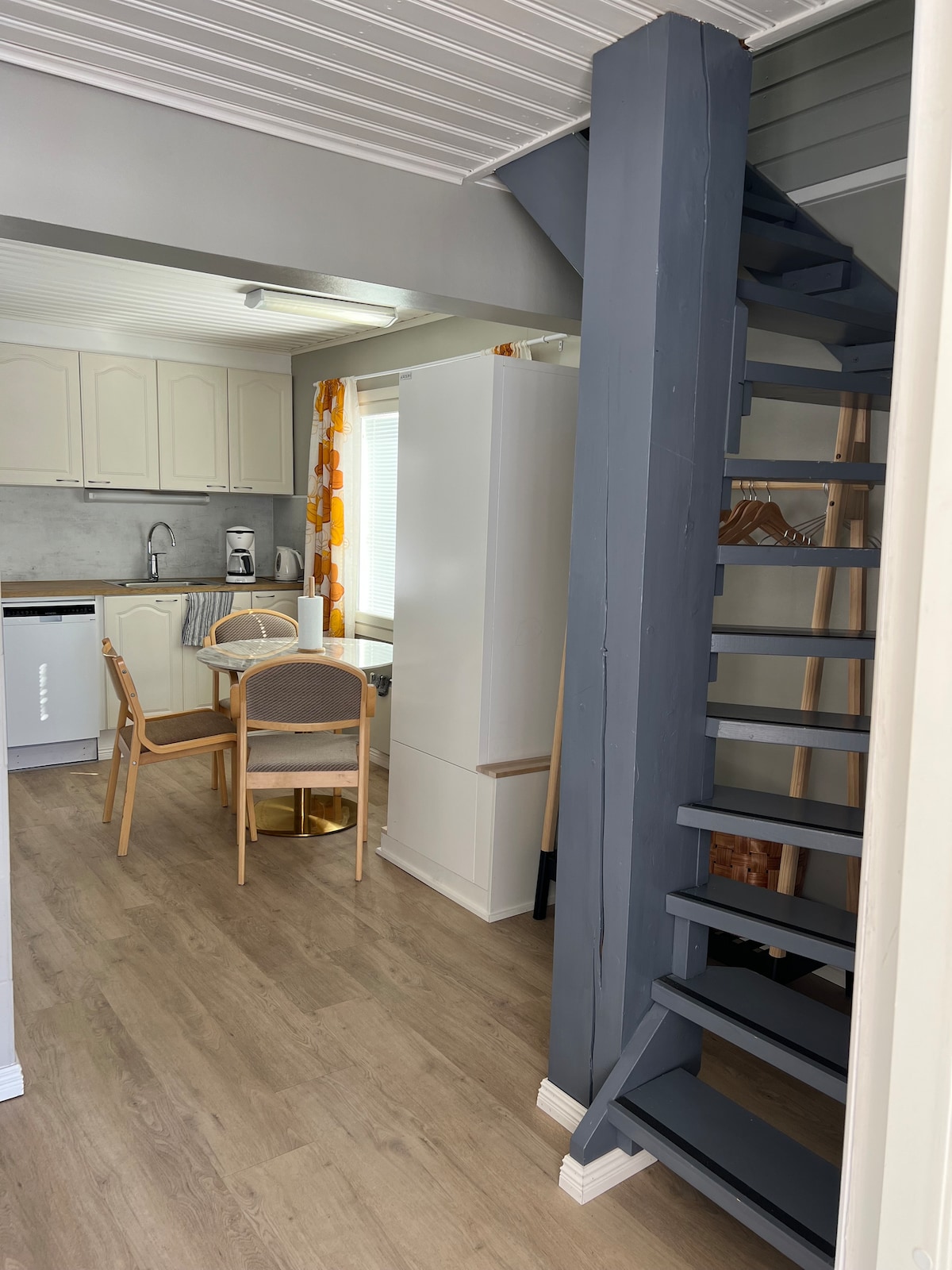 Apartment at the sheltered end of the former village school. The apartment has a kitchen, an open bedroom and a bathroom. Sleeps four. Double bed in the bedroom and a sofa bed in the living room. The apartment has a teacher's platform and outdoor stairs, so it is not accessible. The outdoor sauna is heated for an additional fee. The apartment is located in a quiet area, 8 km from the city center. The rest of the building is for the host's own use. There is room in the yard to stay and, for example, barbecue. Also suitable for families with children.