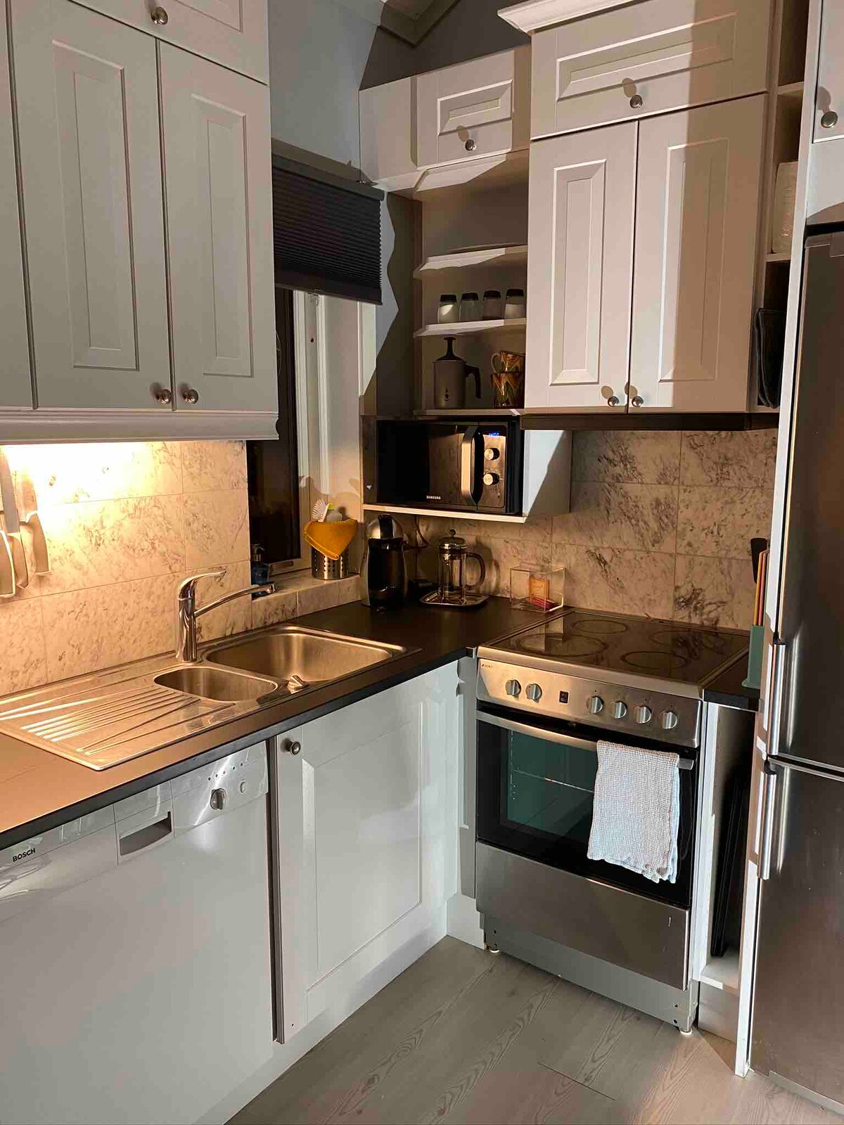 Unique and nice apartment with beautiful south-facing views of the lake and Kalvøya. Centrally located close to Sandvika city centre. 10 min to the train, stores, cinema and restaurants. Walking distance to Kalvøya and Sjøholmen. Cozy and undisturbed villa area. The apartment is newly renovated and is located on the ground floor in Casablanca, a beautiful funky house. It is a lovely studio apartment (45 m2) with a bedroom in the living room, but also with a sofa bed in the kitchen and the workroom area. Private patio and parking space.