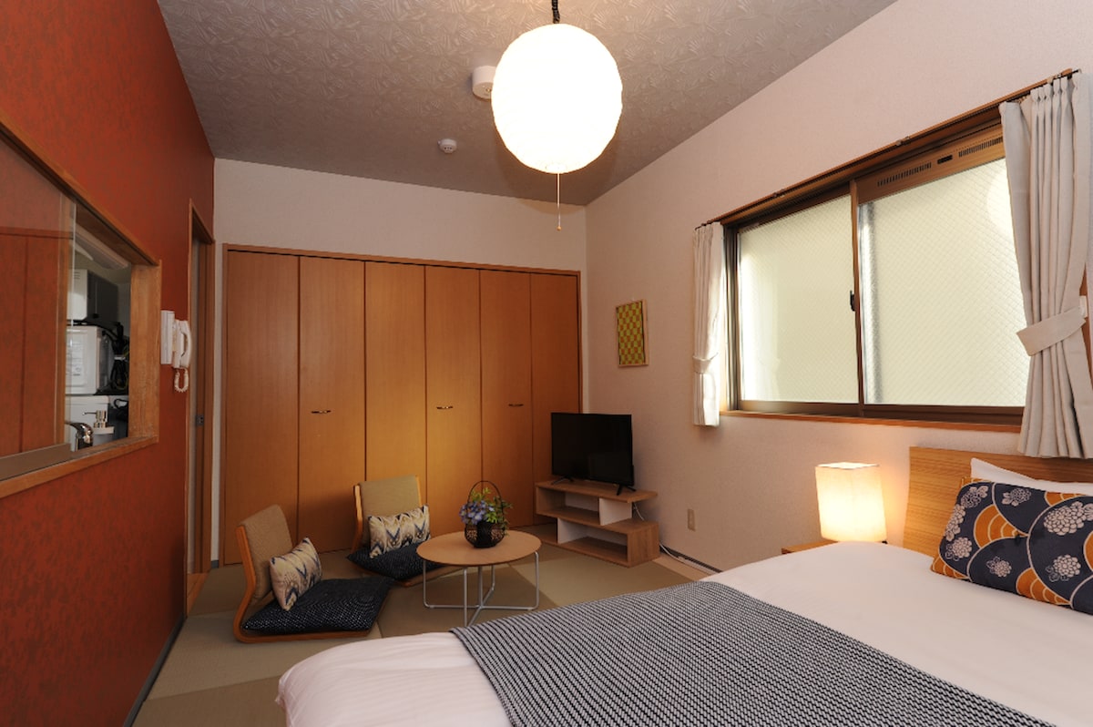 A short walk away, there is the World Heritage Site Kiyomizu Temple and Yasaka Shrine at Kamon Inn Higashiyama Gojo. Around the inn, there are many city buses and many restaurants. You can enjoy Kyoto's Japanese cuisine in this area. This Room A is a completely private vacation rental on the first floor of the building. The space is coordinated by a famous designer. The room also has a courtyard where you can see greenery, making it the perfect place for a little relaxation.