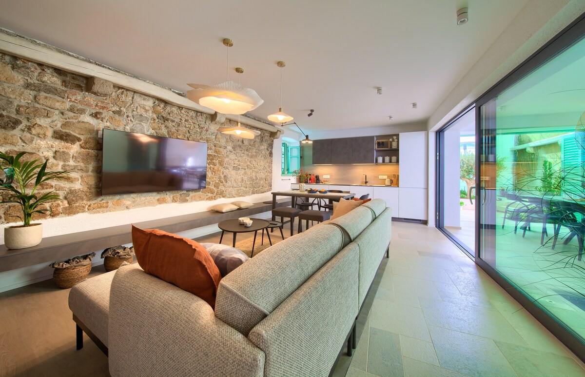 Villa Solaris a newly renovated, over 200 years old stone house. It has 2 stunning balconies, with breathtaking sea views and view over private green Mediterranean garden. In garden house you can relax in private IR sauna (max temperature 75°C), cook or grill your dinner in fully equipped kitchen located by the private 8 by 4 m big heated salt water pool. Air conditioning and floor heating in all rooms. It is located in charming village of Žgombići not far from Malinska on the island of Krk.