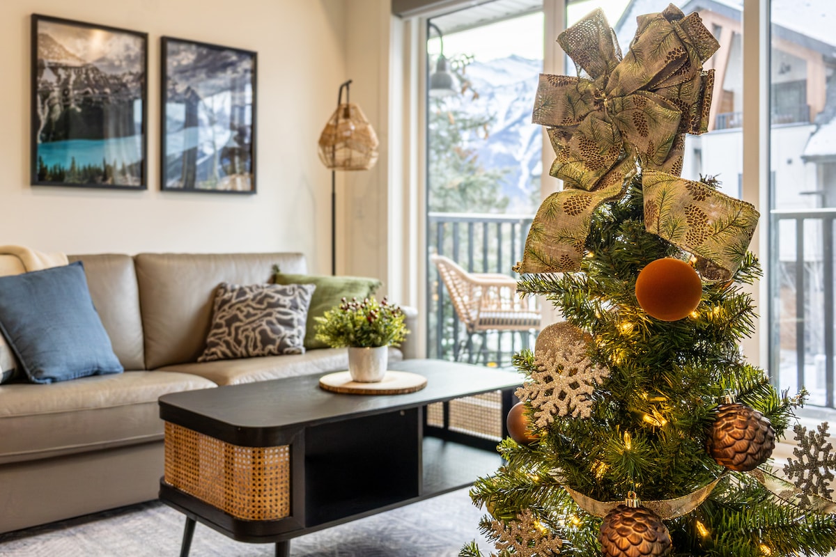 XMAS TREE decorated for holiday celebrations! Beautiful mountain getaway! This high-end 2-bed, 2-bath mountain-style condo offers plenty of space for gatherings. Sleeps 6 with a king bed, single-over-double bunk, and pullout sofa, plus 2 full baths. From the balcony, enjoy views of the pool, hot tub, and mountains. Amenities include a year-round heated outdoor pool, hot tub, gym, on-site coffee shop, underground parking, storage, and conference rooms. Pricing is set - No discounts