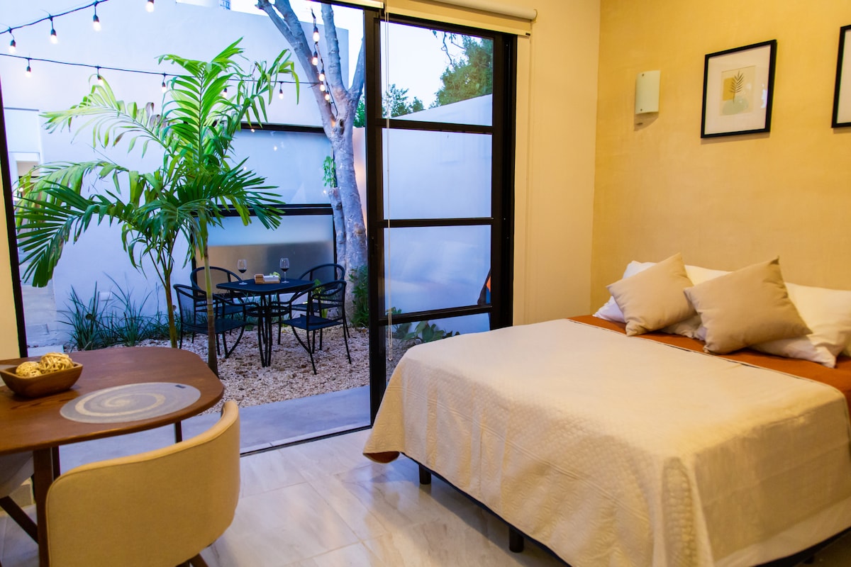Relax and unwind in this newly built Merida oasis. Just a few minutes walk from Parque Wallis and beautiful Capilla Nuestra Señora del Carmen. Less than 10 minute drive from the Paseo de Montejo, Plaza Grande, Gran Parque La Plancha, and much more of what this wonderful city has to offer. The main casa features: King bed w/ on suite and private atrium, Full kitchen w/ atrium, open living w/sofa bed, half bath, and laundry The casita is a queen studio w/ full bath, atrium and kitchenette.