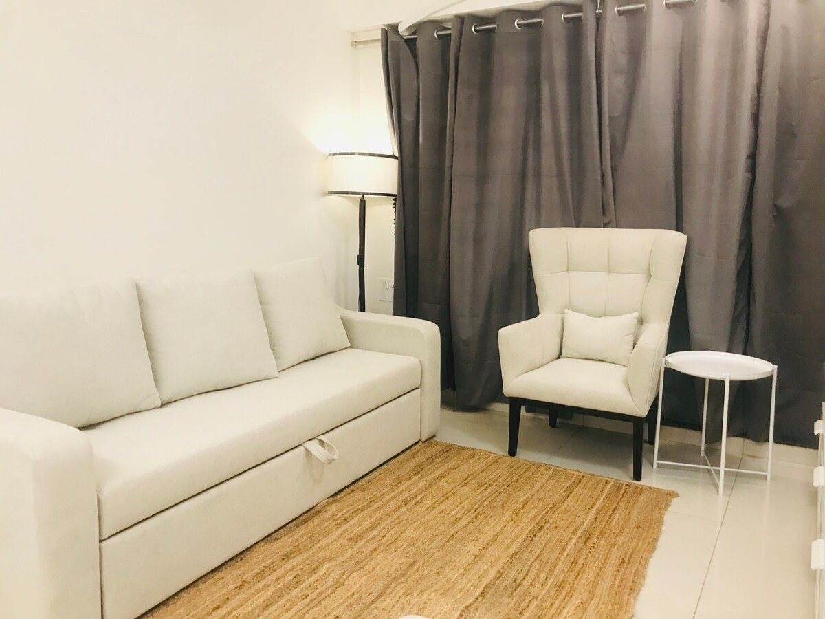Simple minimalistic living.All spaces have neutral tones.Lighting is done to illuminate the space nice & bright but not to hit your eyes directly.The pool, gym and sauna can rejuvinate you, along with a kids play area for your child.We have a mountain view overlooking lush greenary.Rainy days are treat to eyes.King size bed and king size sofa bed for better comfort. It was furnished for our own stay, so enjoy and take care of our small cozy apartment as your own. Mi Casa , Su Casa !!