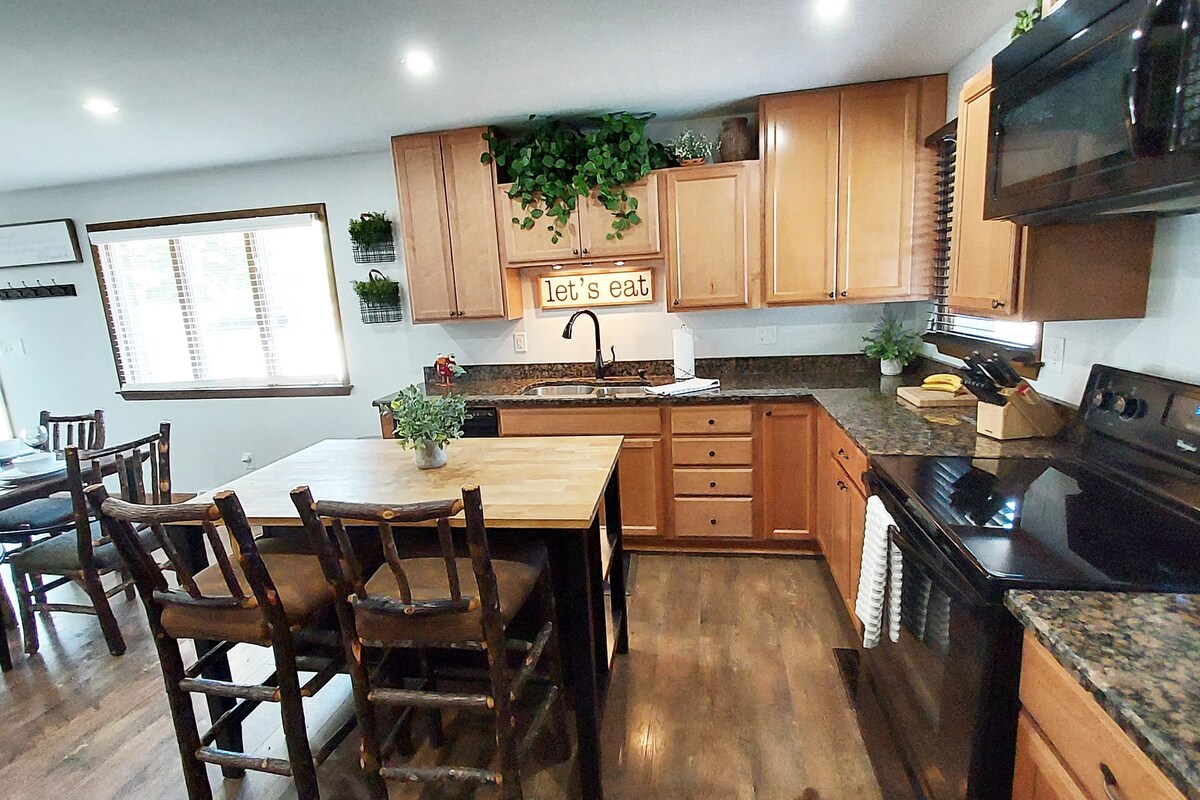 Create your memories here. This spacious 4 bedroom 3 bath retreat can serve as your vacation getaway. The over-sized farmhouse table expands to seat up to 15 and opens to the large living area. The front enclosed porch and the rear patio overlooking the 10 acre wooded lot and farm fields can be the back drop to your family reunion, baby shower, bridal shower or corporate retreat. Our great room boasts a 54" Smart TV and hi-speed wi-fi access.