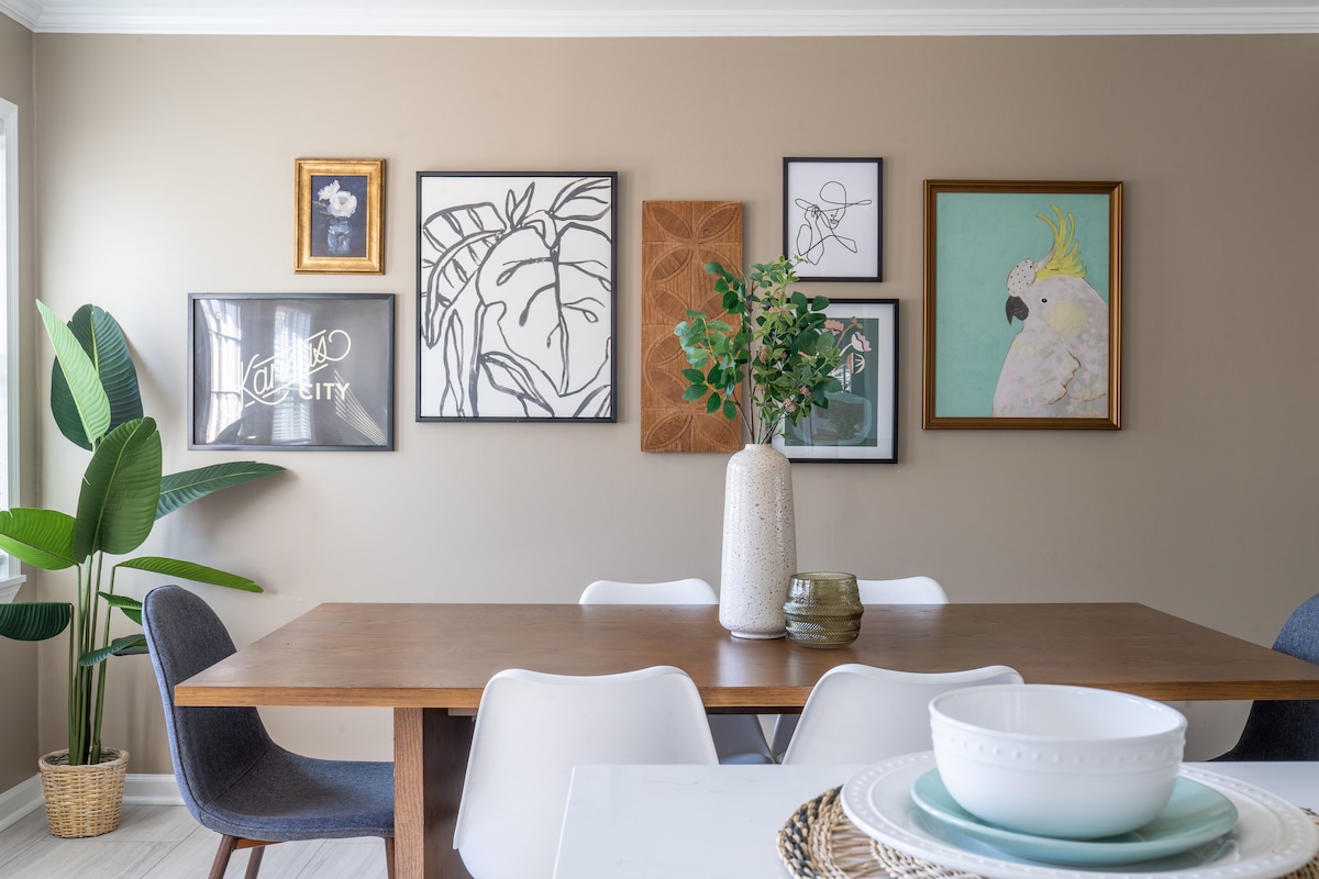 Designer-renovated 1900s bungalow with curated décor, modern kitchen, two full bathrooms, fast WiFi, and dedicated workspace. Thoughtfully designed by a former interior designer, blending historic charm and boutique style with everyday comfort. Easy drive to Kansas City concerts, restaurants, and stadiums. Located in a quiet, walkable neighborhood near Main Street shops and cafés. 30 minutes to Children’s Mercy Park and 35–40 minutes to GEHA Field at Arrowhead. Primary suite with en-suite bath.