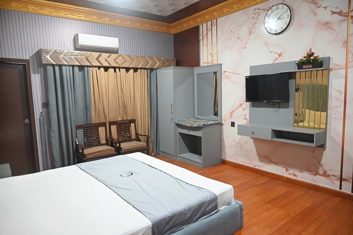 Spacious Executive Suite in DHA Phase 8 with an upgraded boutique finish and extra comfort. King bed, sitting area, fast Wi-Fi, smart TV, minibar/fridge, safe and a luxury ensuite—perfect for longer stays and work travel. 24/7 support; RFID key-card access at check-in.
