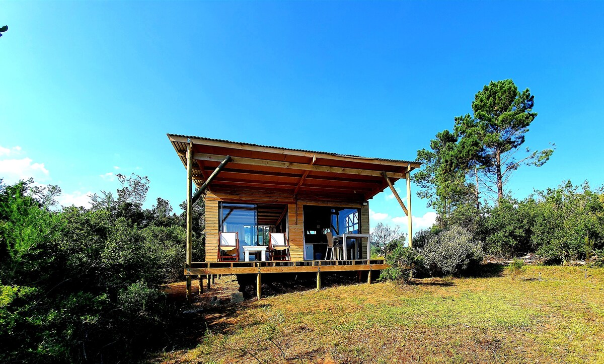 The Tuffet is an elegant studio ideal for couples seeking a romantic oasis in the beauty of the Garden Route. With a private wood-fired hot tub overlooking idyllic views of the lake and mountains, this stylish, secluded space has all the simple luxuries needed to rest in nature. Pet-friendly and off the grid with air con, Wi-Fi, TV, Amazon Prime and all the essentials. Relax and reconnect with each other. Enjoy our farm trails, shared pool with stunning views, and the neighbouring national park.