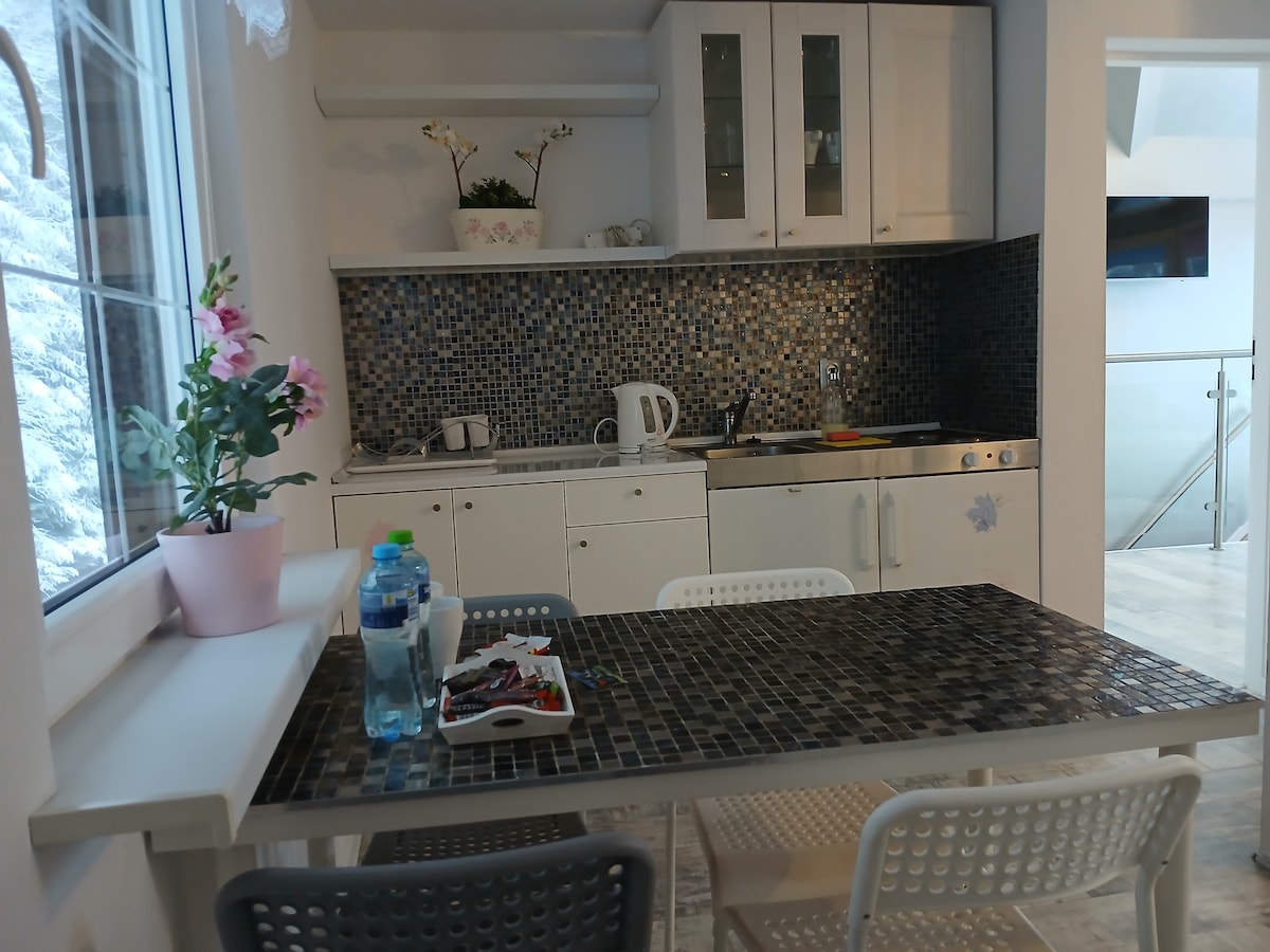 The apartment (in the Guest House) offers 3 rooms: a comfortable bedroom with a double bed and a TV, a cozy living room with a large window and a TV, a room with a sofa bed and a kitchenette, and a private terrace. The apartment also has free Wi-Fi and its own private bathroom. It is the perfect place to relax with a beautiful view of Szrenica.
