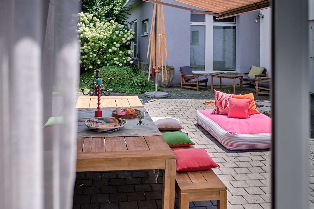 NEST NO.1 - a bright ambience in a clear feel-good design. On more than 110 sqm the guest can expect a spacious dining area, 2 cozy bedrooms with large double bed, a sunny kitchen, a daylight bathroom and a separate guest toilet. Our large living room invites you to linger on the large sofa. The terrace with a small garden offers additional space and in the evening you sit there and enjoy the last ray of sunshine and let the day end. Frankfurt airport: 28km, Frankfurt fair 37km.