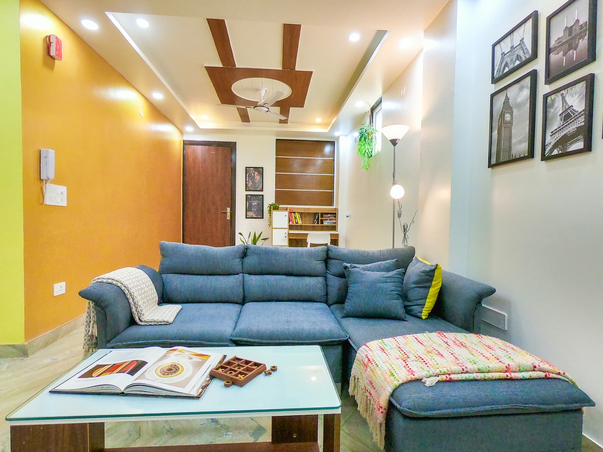 Super Location! Serene Apartment is in the posh GK-1 South Delhi, close to 3 metro stations, M block market & convenience stores. Located next to huge park with a gym,lots of trees & birds to sooth your soul. The apartment is full of natural light & ventilation. There is 1 Bedroom+1 Living Room(with a large sofa bed)+balcony+fully equipped kitchen+1 Bathroom+Hi-speed WIFI. The place is newly done up in modern style. It's on the 2nd floor with staircase access only, luggage help is available.