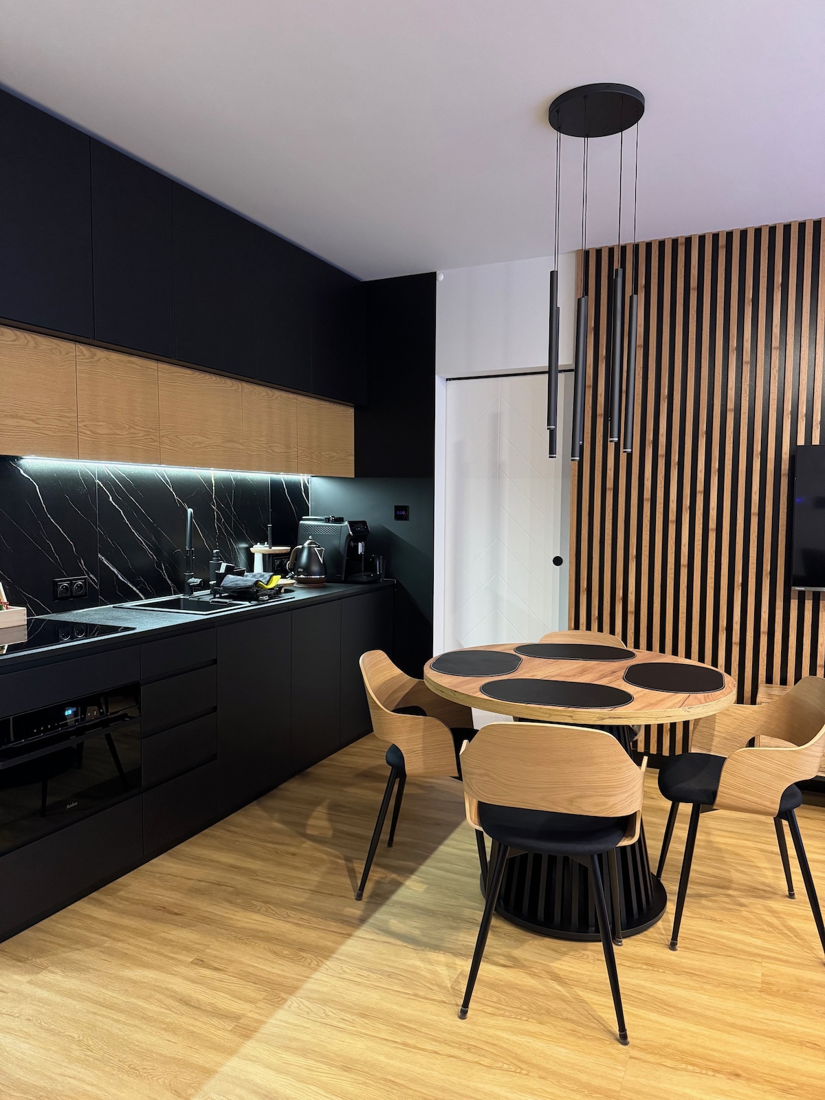 An apartment in a complex right next to the forest, among the fields and the silence of mountain nature. It is an ideal space for people looking for rest away from the hustle and bustle, and at the same time valuing comfort, style and functionality. The apartment is decorated in a colorful way, but with a great sense of taste – warm colors and cozy interiors make you feel right at home. The apartment also has an exercise ladder, perfect for a morning start or evening stretching after mountain hikes.