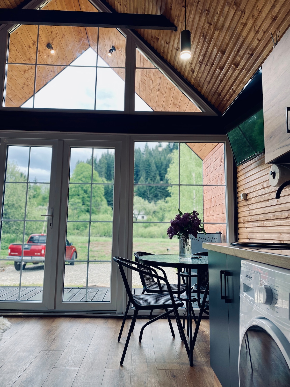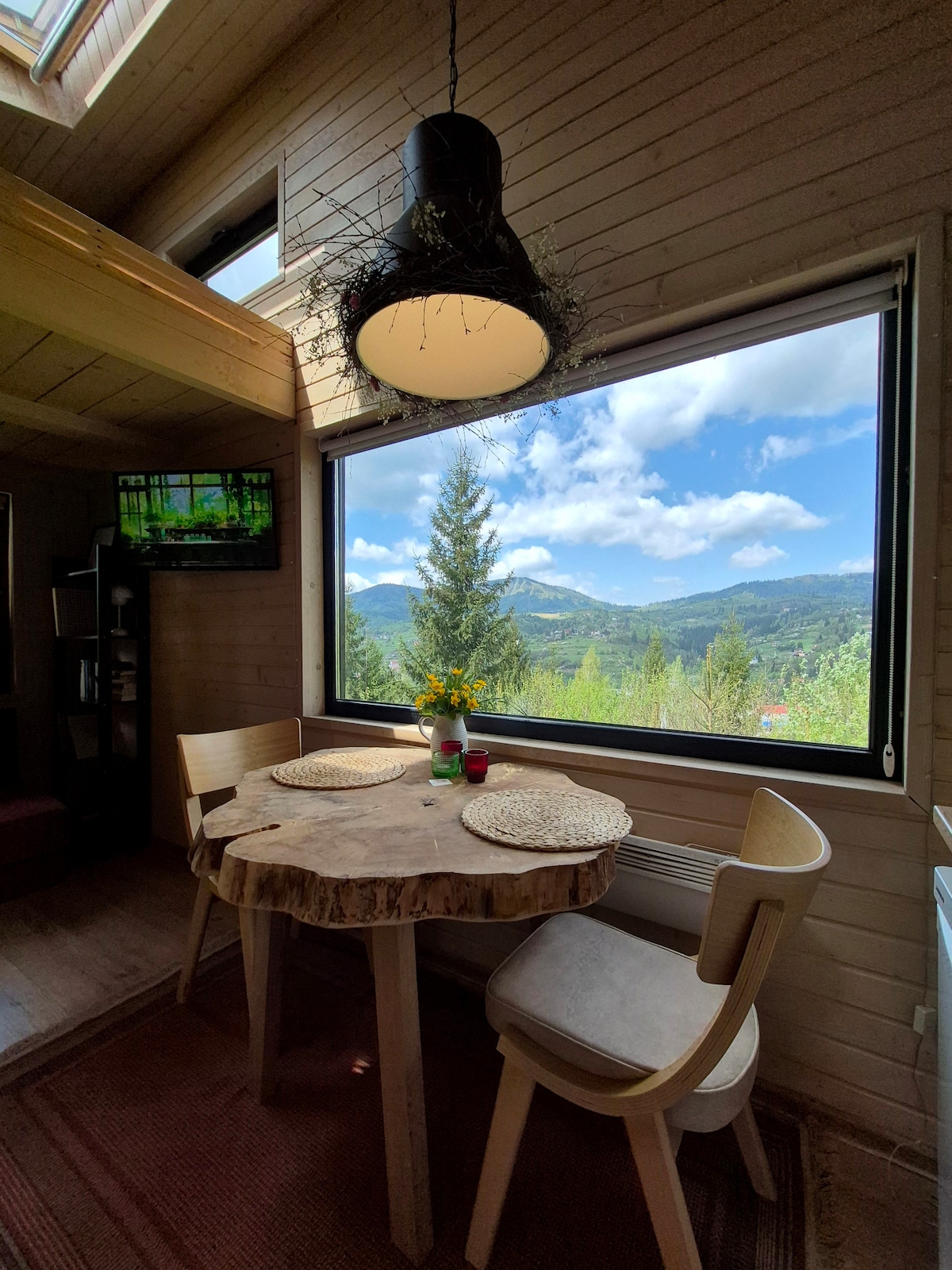 Minicottage with panoramic mountain mountain view in Slavsko. A quiet and aesthetic place on the slope mount Pohar. Inside everything is designed for a comfortable stay for up to 3 guests. Impressive view from the windows. Panoramic terrace. Window above the bed for stargazing. Fireplace. Starlink internet. Well equipped kitchen. A library. Transfer to the cottage. Barbecue area. Pets welcome.
