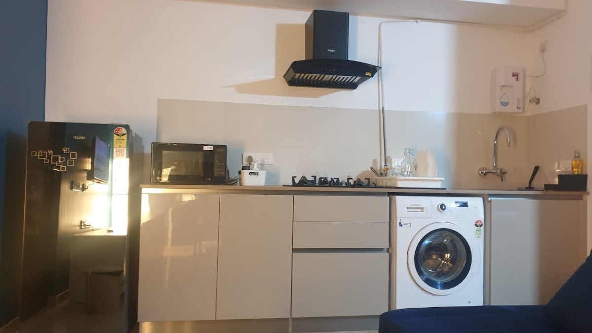 Luxury studio with cozy interior in Hiranandani Estate with stunning creek & Mountain View Amenities • Couple Friendly • Queen-size bed with plush linen and pillows • Smart TV, high-speed Wi-Fi, and air conditioning • Fully equipped kitchenette with refrigerator, kettle, and utensils • Modern bathroom with premium fittings and hot water • Private balcony with panoramic view • 24x7security, elevators, and secure access Ideal for solo travelers, couples,business guests or Small family