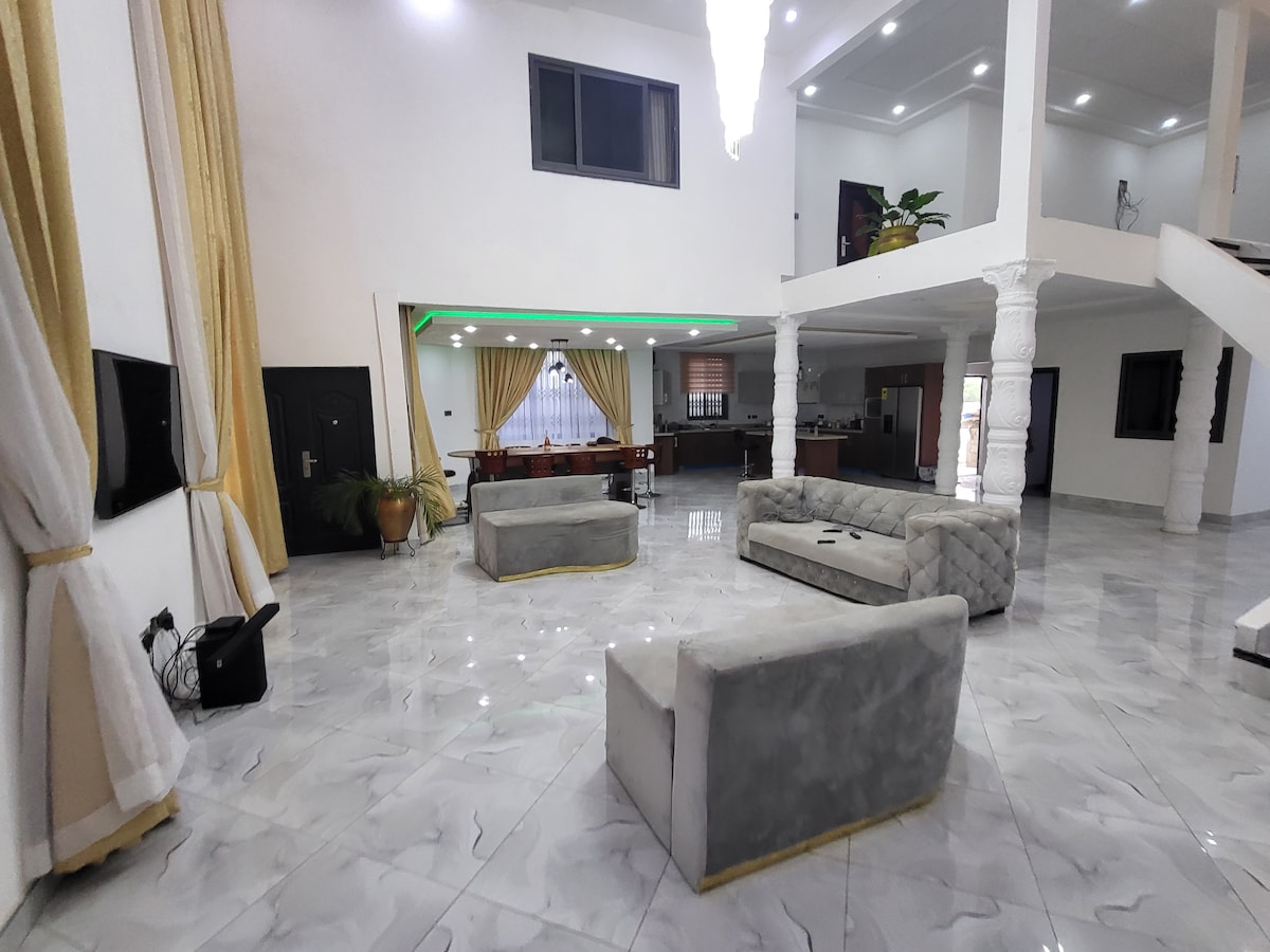 The Borkai offers 6 beautiful ensuite including 1 Master Suites. This Villa is ideal for corporate, family reunion and special occasions. At Extra Costs, Clients can have access to our in house Chef, Car, internet access and Groceries Our open-floored design offers a luminous living room under a crystal chandelier that leads to the 10 sitter dining room and a modern fully furnished kitchen. Clients can enjoy outdoor space enclosed in an electric fenced 12 feet high wall.