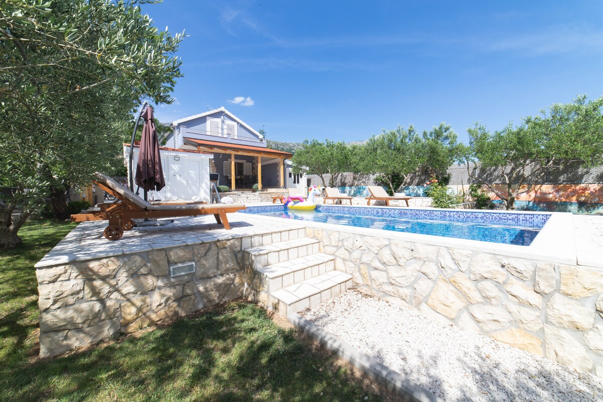 Charming villa with big garden and private pool. Complete privacy all around the house, great for relaxing and enjoying the sun by the pool. Villa has 2 floors, 2 bedrooms, one bathroom, fully equipped kitchen and living room. On upper floor we have rooms with nice balcony with a beautiful view at sea .On ground floor is kitchen/living room,bathroom, and outside you'll enjoy terrace with natural shade. WiFi internet connection, Air conditioning, all kitchen and washing machines are free to use.