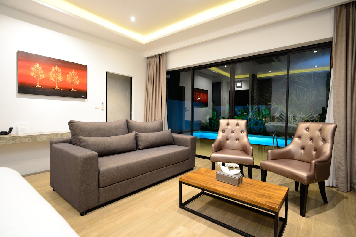 Junior Suite with private pool near Bangtoa Beach. Tiny luxury private pool suite resort with only 6 suites. Your suite is 64 sqm. large and decorated in luxury/loft/modern style with full amenities. (We randomly choose the room style for you.) Everyday cleaning without charge. Taxi service, excursion, vehicle rent, gym, free street parking, and night security guard. Only 2 mins ride to Bangtao Beach.