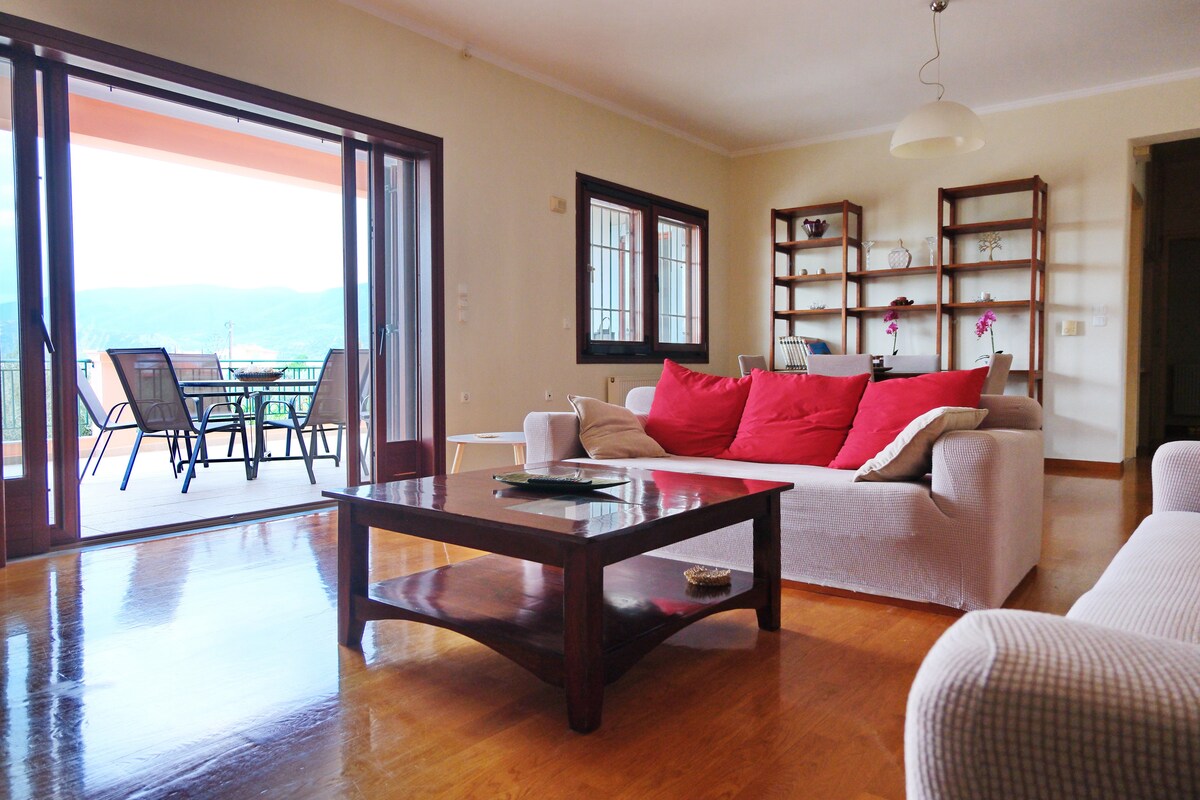 Kapsalakis Penthouse is located in one of the most central spots in Corinth, just a three-minute walk from the main square (Panagi Tsaldari or Perivolakia) and the city's shops. Also within walking distance (6 km) is the much talked about Kalamia beach and within a five-minute drive the beautiful Loutraki with its Thermal Springs and nightlife. The apartment is 40 sq.m. and has a 120 sq.m. balcony overlooking the entire Corinthian Gulf.