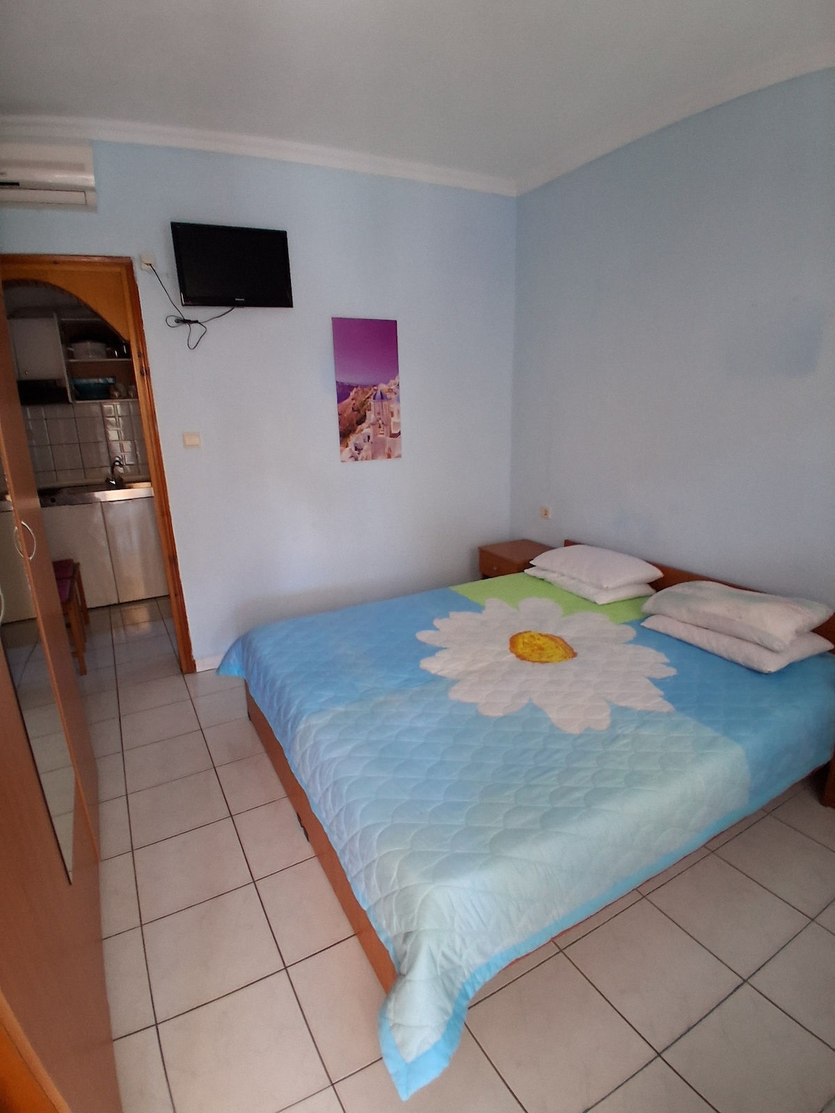 Ιδιωτικό studio με διπλό κρεβάτι, μπάνιο, μπαλκόνι και εξοπλισμό πρωινού. Είναι 25 τ.μ. Περιλαμβάνει ψυγείο, φούρνο μικροκυμάτων, καφετιέρα, τοστιέρα, smart TV , κλιματιστικό, ασύρματο Ίντερνετ και ζεστό νερό 24 ώρες. Το μπαλκόνι έχει μια υπέροχη θέα στην θάλασσα και βρίσκεται απέναντι από οργανωμένη παραλία, εστιατόρια, καφετέριες, μπαρ και beach bar όπως επίσης και super market, αρτοποιία, φαρμακεία, τράπεζα και διάφορα καταστήματα. Βρίσκεται στον πρώτο όροφο ενός κτιρίου χωρίς ανελκυστήρα.