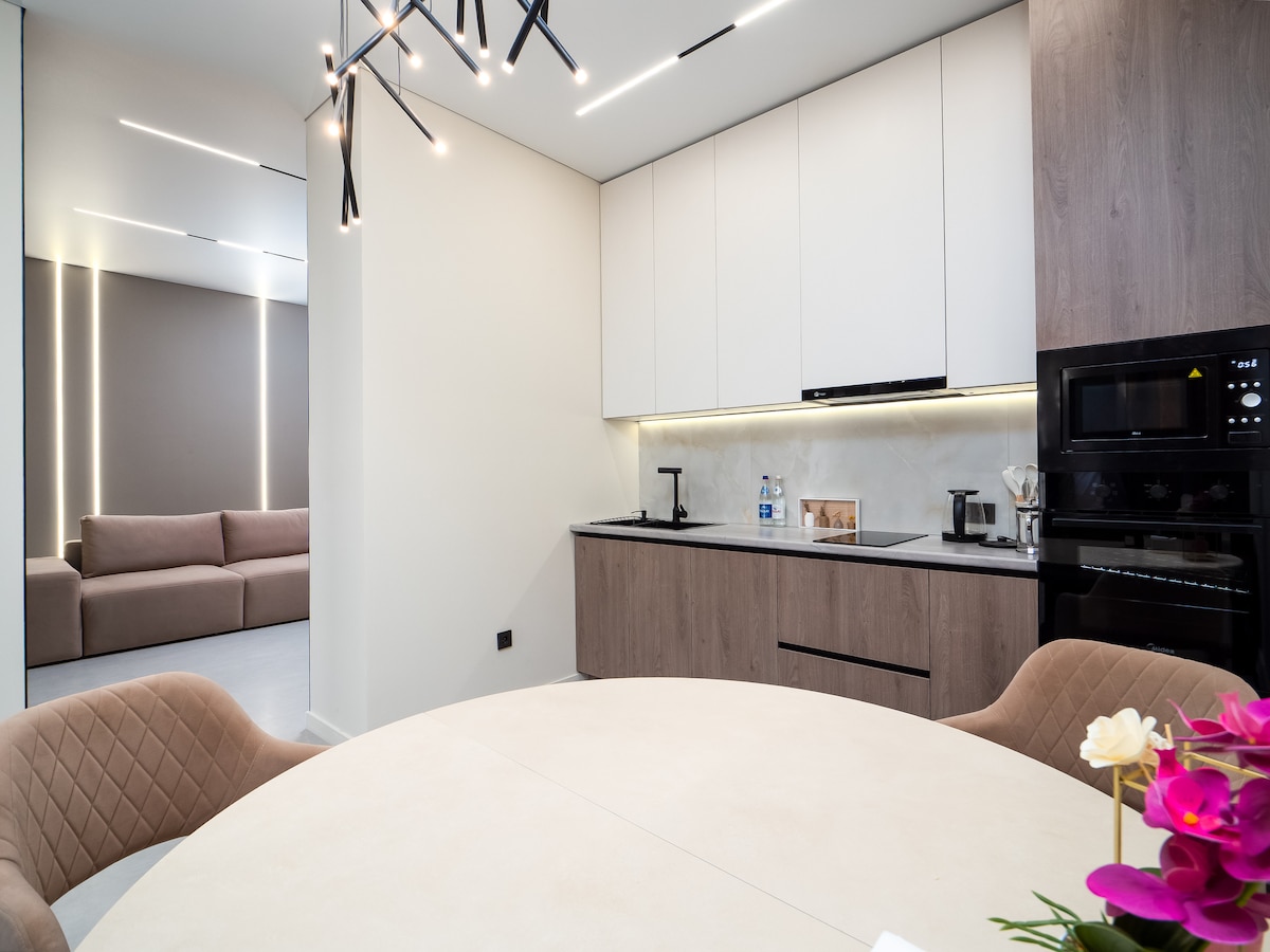 Dopamine apartment in the city center! A great place for a comfortable stay: • A spacious and bright living room with high ceilings. • Equipped kitchen for those who like to cook. • A cozy bedroom with a great city view. • Within a walking distance there are shops, cafes and restaurants, parks, pedestrian streets. We created this space to make you feel at home, and the city rhythm is always nearby.