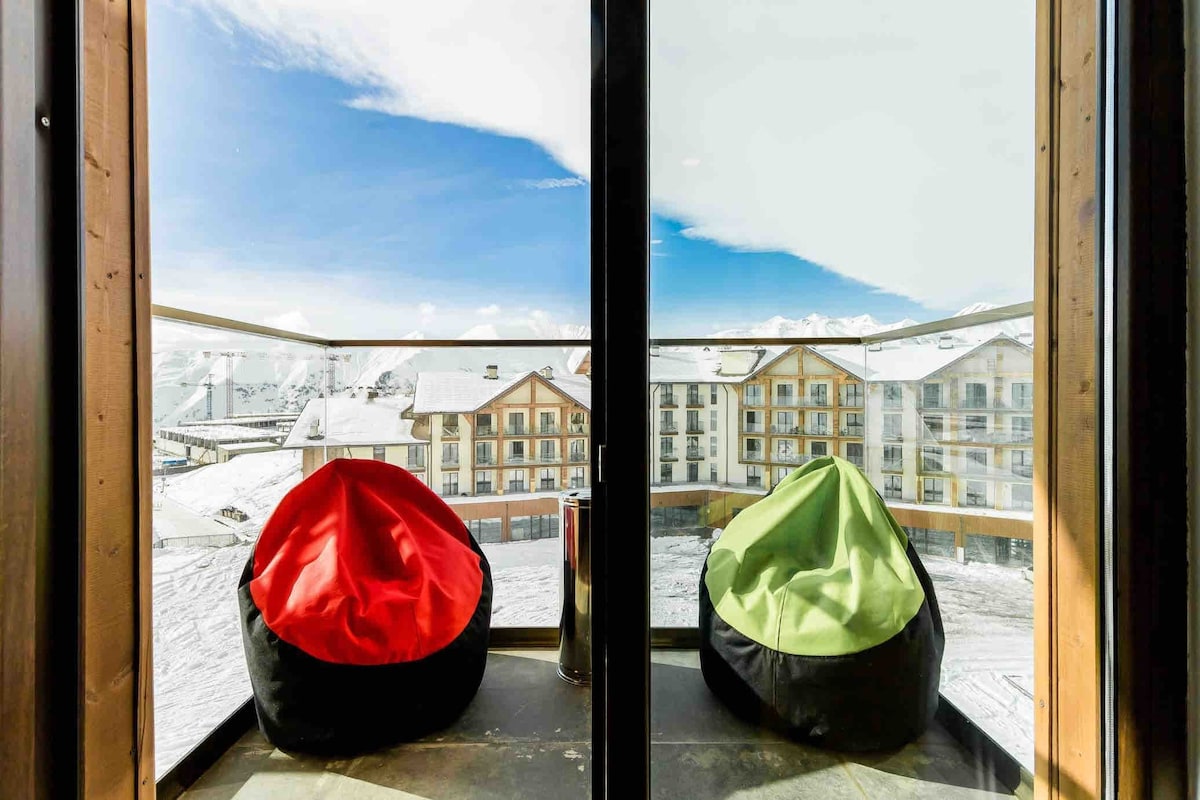 Well decorated and furnished Studio Hotel apartment with spectacular mountain view from both balcony and large king size bed, so you can enjoy the spectacular view from balcony or from the bed, it is located in the 2nd floor of loft 2 building of Redco Complex in Heart of New Gudauri, right next to Gondola Ski lift. The apartment has unique design, stunning mountain view from balcony. The apartment has super great location in the centre for those who like Skiing & other snow and mountain sports.