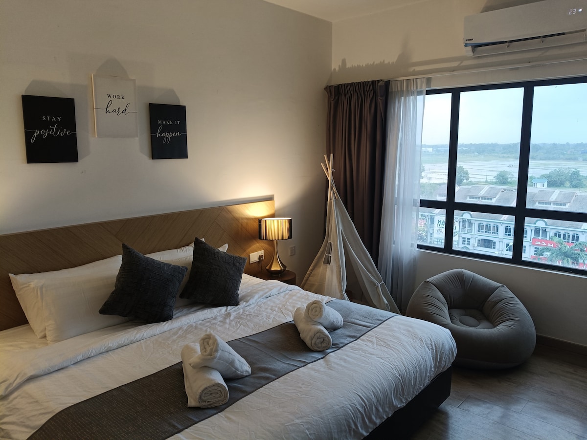 Modern and cozy H Elite Design Suite, operated by AGhome (not part of H Elite Hotel). 🛏️ Room & Sleeping Arrangement 1 King-size bed – perfect for couples or anyone who loves extra comfort 1 Single pull-out bed – ideal for a child, an extra adult, or a friend Enjoy a clean, comfortable stay with essential amenities. Located just a 1-minute walk from Mydin Tunjung Mall, with restaurants like Coefee Bean, Zus and shops nearby—convenient for both leisure and business travelers.