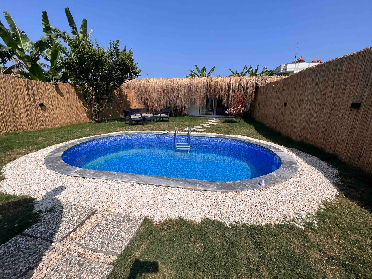 Forget your worries in this spacious and serene space. A peaceful and quiet environment where you can see every shade of green from your terrace. While sunbathing with the unique view of the pool, you will cool off with cold drinks in the pool bar. The village centre is just a 20-minute walk away and you can also use our free bicycles. In addition, you can get breakfast, lunch and dinner for a fee in our restaurant.