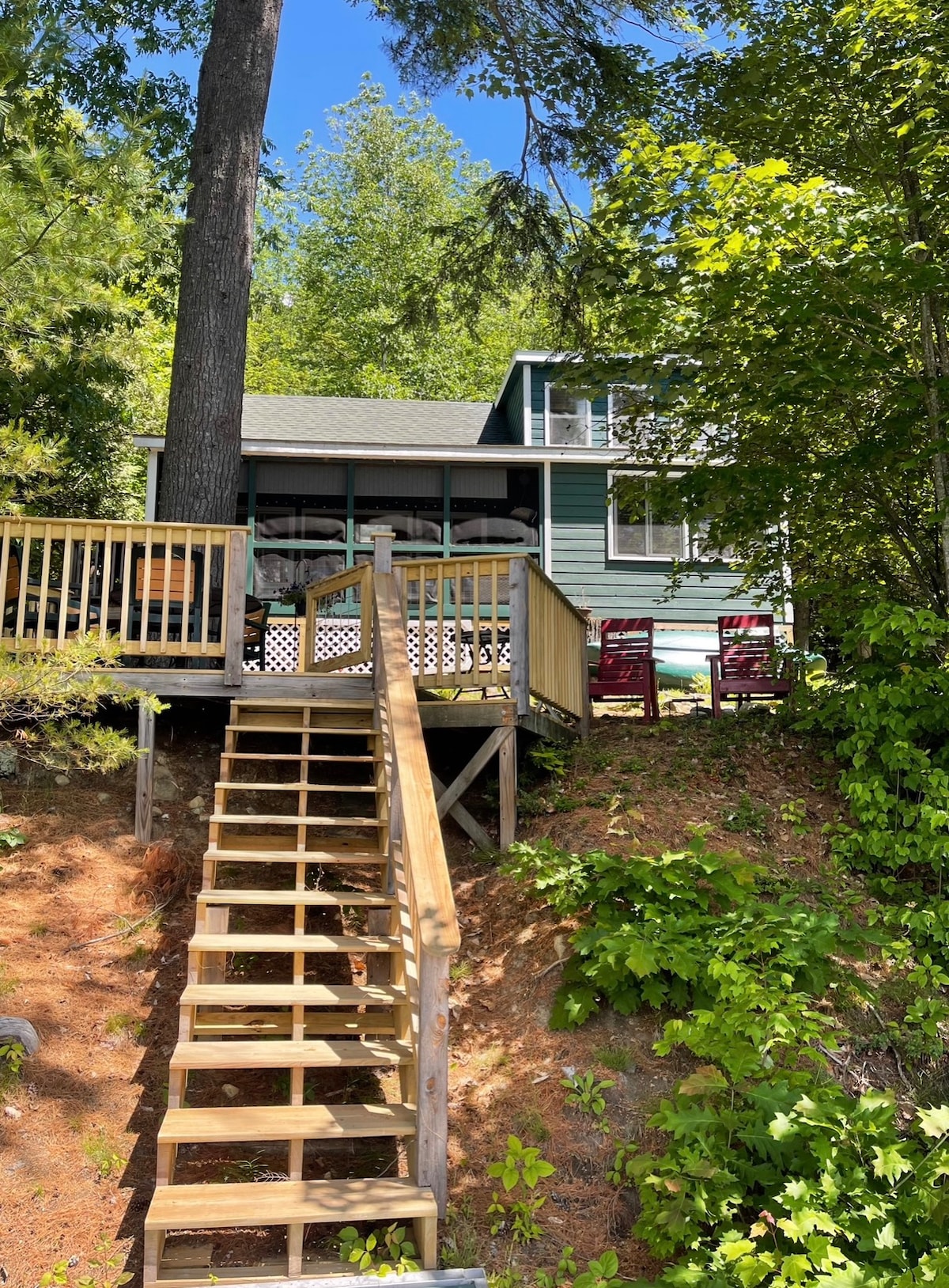 Step out of the screened in patio to lakeside relaxation. Dive into crystal waters, snorkel or float with a cool beverage. Kayak or canoe out to Turtle Cove and enjoy the wildlife in this natural waterway teeming with birds to include our resident Blue Heron, ducks, geese, and loons who make this place their home. We have the fortune of bald eagles in several tall pines. Turtles sunning on doting rocks and lily pads in bloom greet us each day. It is a natural water landscape.