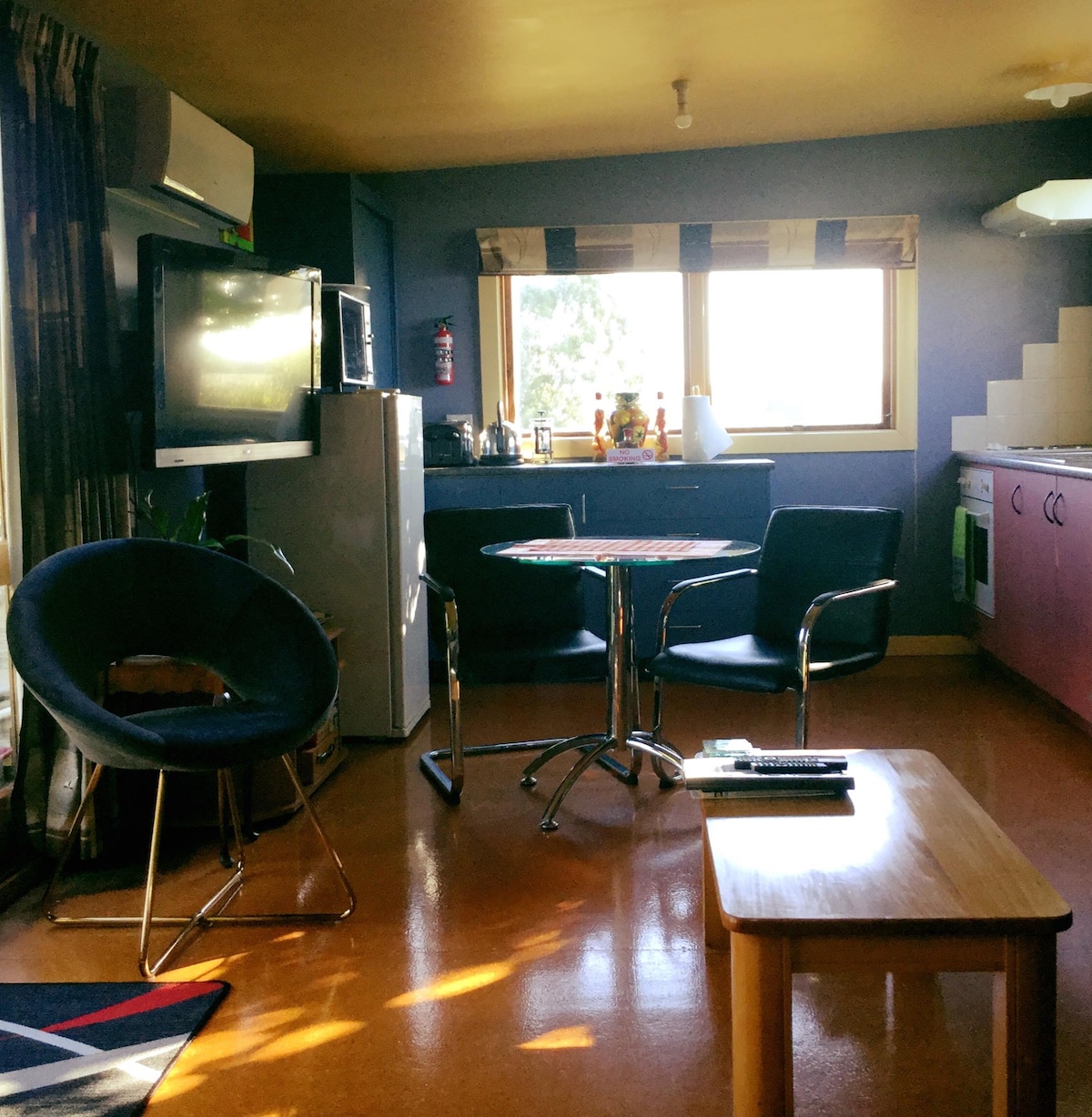 Sunny, self contained rooms including separate kitchenette & bathroom with access to shared deck & garden. Own access, twin single beds & free ON STREET PARKING. No extra cleaning fee. I personally clean thoroughly and sanitise all hard surfaces, but expect you to clean, dry & put stuff away that you use where you found them. Bus is Myway, which you book & it picks to up close by or 25-30 minutes walk to town centre, 5 min drive. Supermarket 10 mins walk.