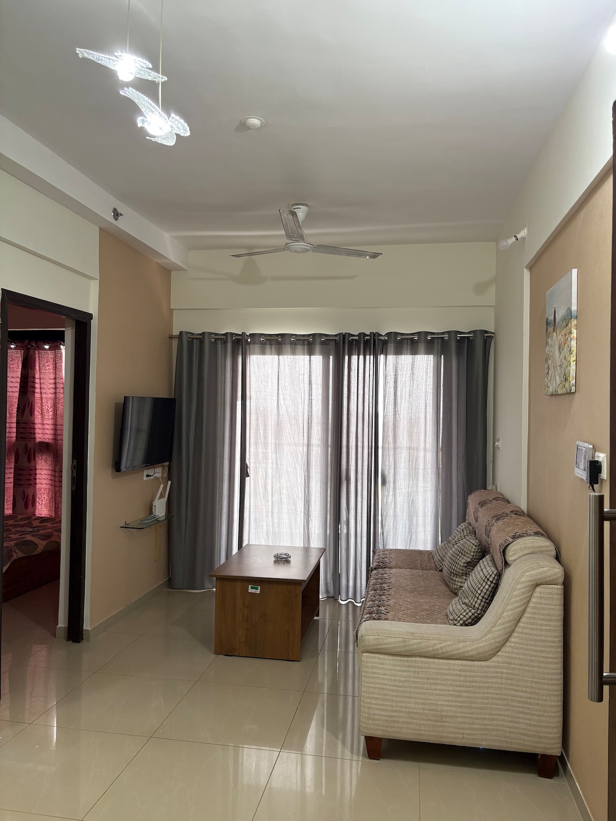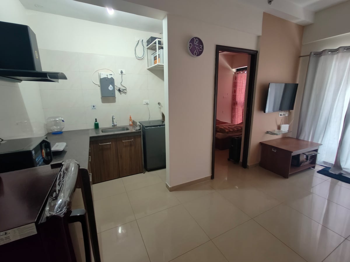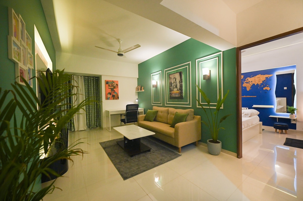 This cozy stay comes with a spacious terrace, perfect for sunset views and sky-gazing with friends. Enjoy your morning coffee or unwind at night in total peace-no disturbances, just calm vibes. Big private terrace Near the airport (super convenient!) Free covered parking on-site WiFi for work or chill (60mbps) Inverter power backup Induction&Kettle Perfect for couples, friends, family. Pet friendly Electric Vehicle charging point This space is your little slice of comfort under the open sky.
