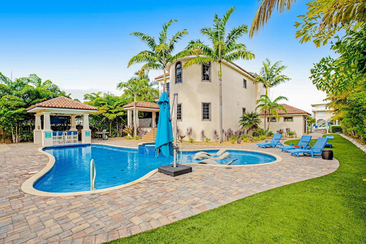 Come stay at this brand new home construction on a deep and wide canal leading to the ocean with pool and exotic decor. 75 foot dock with water and electric. Top of the line appliances with a fully stocked kitchen. Spa style showers with high end decor. Luxury at its best. Heated pool with sundeck and lots of seating around the edges. (Pool heater is an additional $100 per stay). Ground level cooking and dining for those beautiful days after boating or while laying around in the pool.