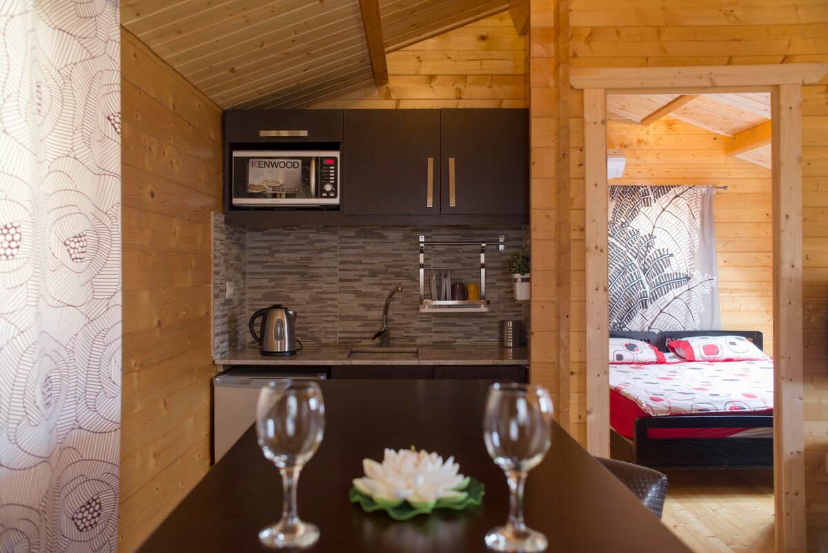 Lovely chalet with breathtaking view, wide outdoor space and a fire pit. Laid on on a private land to enjoy a secluded stay. A rustic wooden cabin with a mini kitchen and a toilet, ideal for authentic immersion in nature, and a memorable gateway.