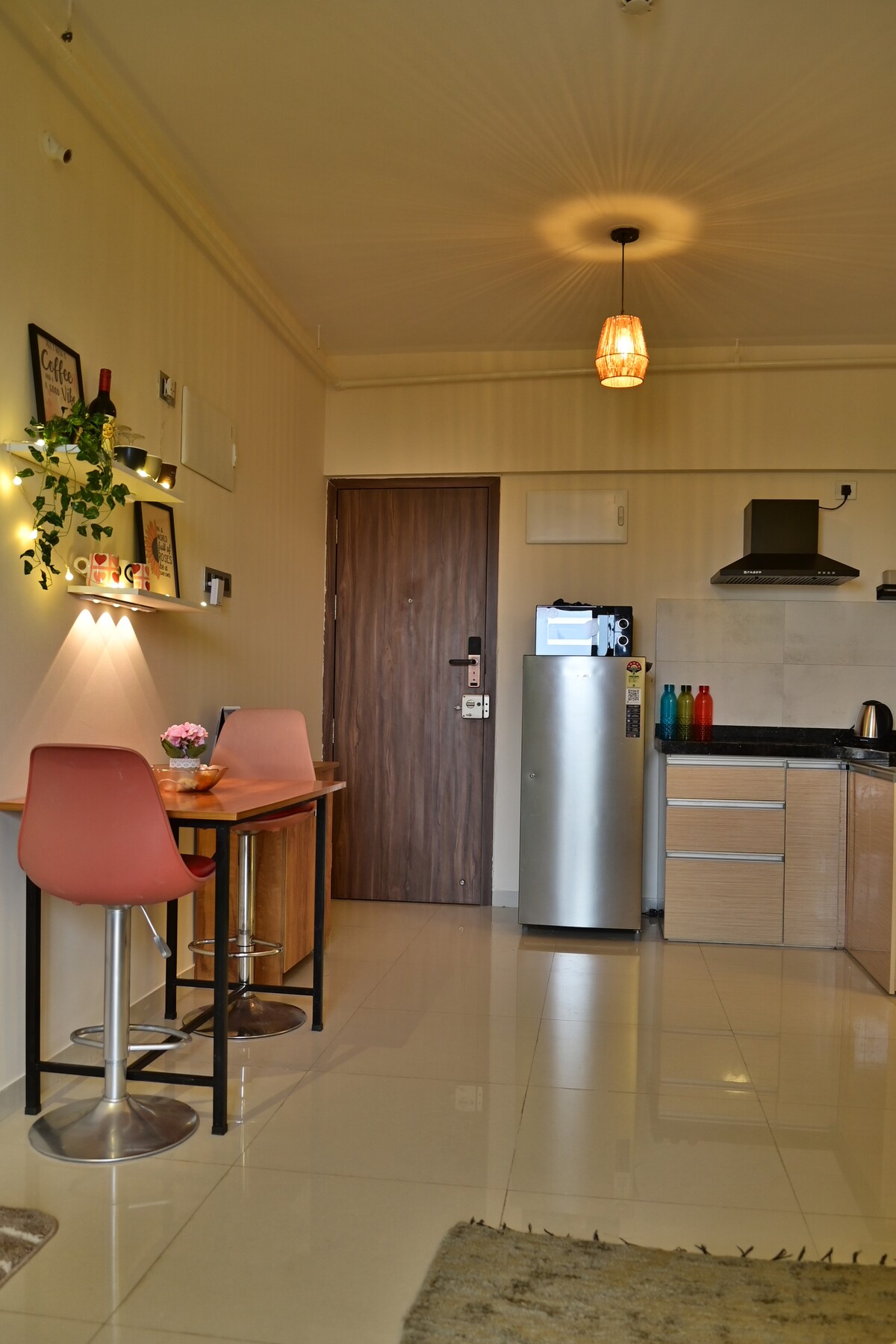 This place is luxurious 1 BHK couple friendly offers modern aesthetics & fully loaded apartment, making it one of the best in Kharadi, Pune. Located just a 5-minute walk from EON IT Park, Barclays, Citi, British Petroleum, & with Magarpatta & Pune International Airpot only 7 km away, it's in a prime spot near cafes, restaurants, shops, public & private transport in Kharadi. Living area features a cozy sofa & Apple TV with OTP channels , Bar unit perfect for relaxing after a day of exploring