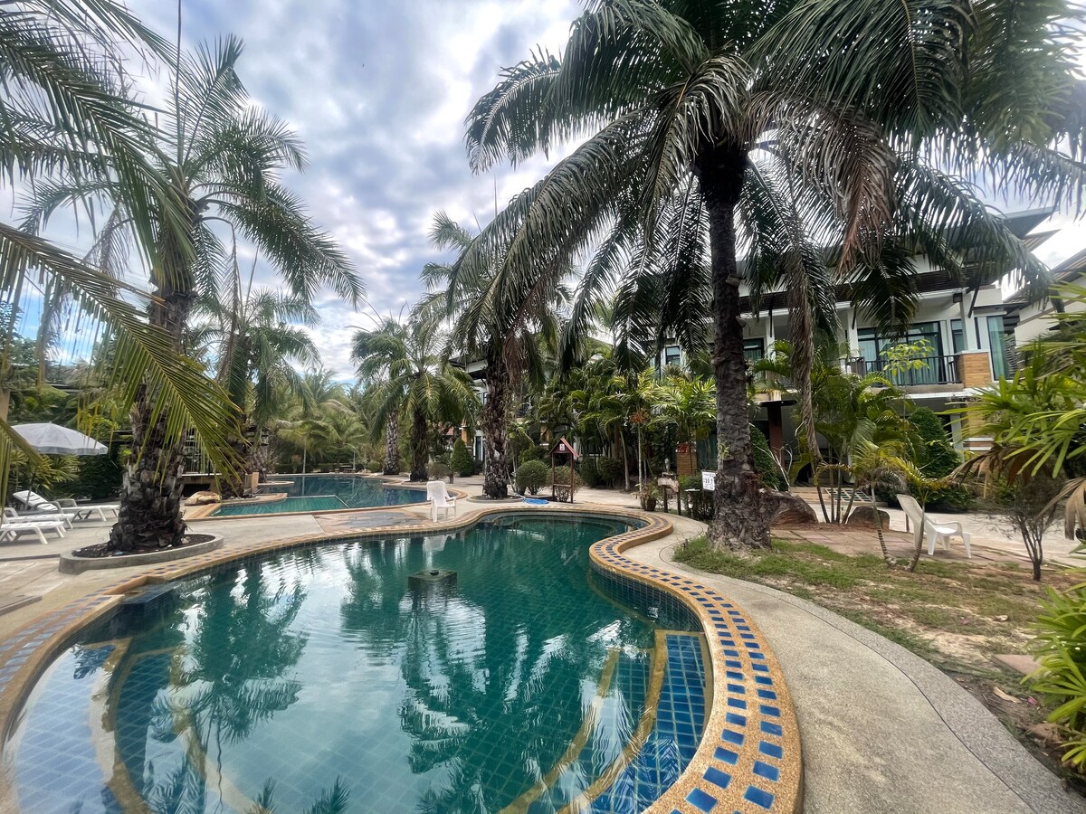 Our accommodation is located in the municipality of Khlongthom District, Krabi Province. It is close to restaurants, convenience stores, department stores, fresh markets and many tourist attractions in the area. We are a small homestay, a garden house in a palm garden in an area of 7 rai (approximately 2.8 acre), which is next to a natural canal. It is completely fenced. You can bring your pets to run around in our garden and sit by the canal.