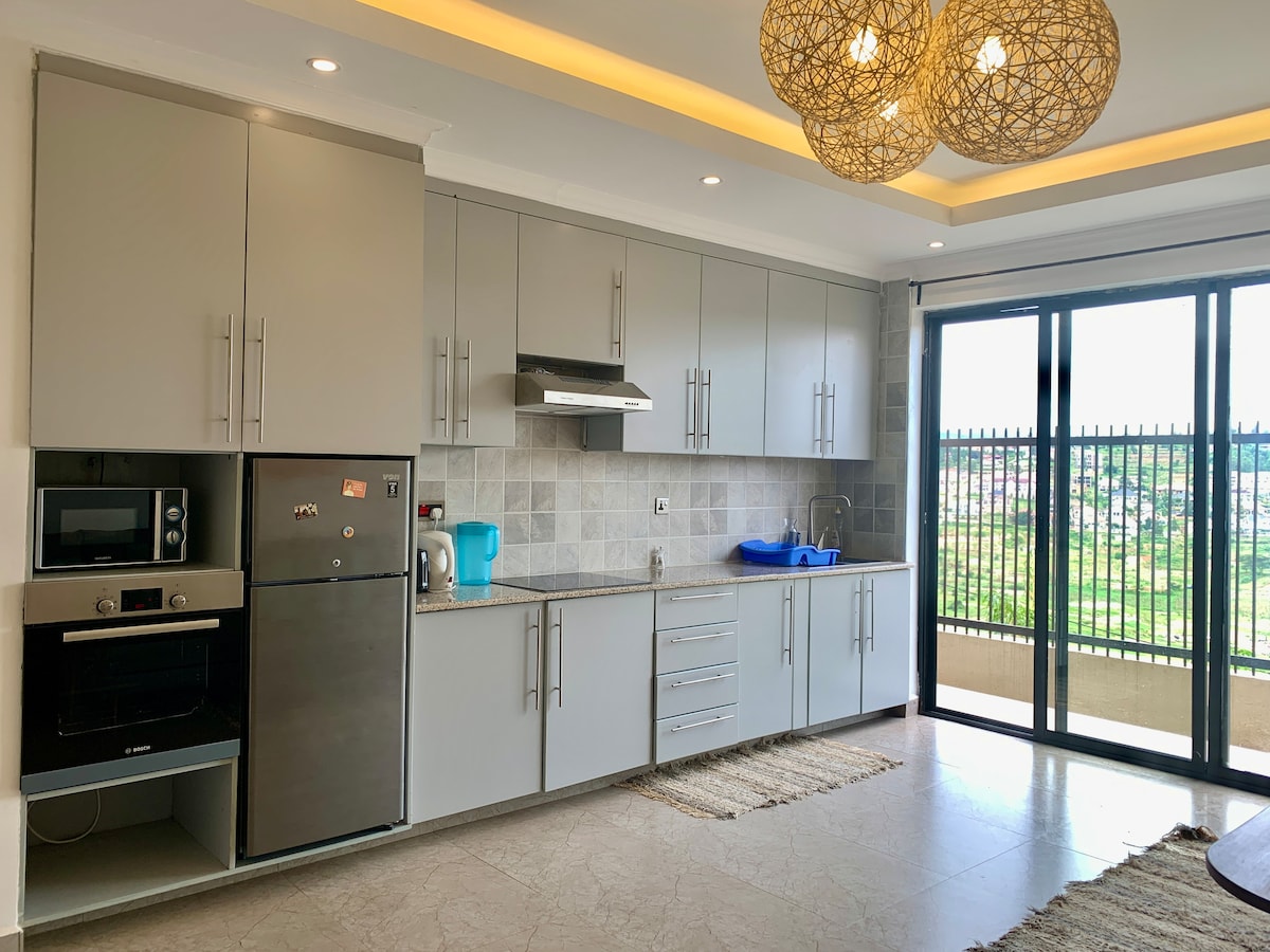 Kick back and relax in this calm, stylish space. Located in Kigali's most sought-after neighborhoods, this beautiful unit is on the 6th floor providing panoramic views of the city and surrounding hills. It’s next to Delight Hotel where you can access a pool, gym and a restaurant. This exquisite apartment is 15 minutes drive to the airport, 8 minutes drive the Convention Centre, 2 min from Simba shopping centre and 6 min from King Faisal Hospital Kigali. It’s your ultimate home away from home.