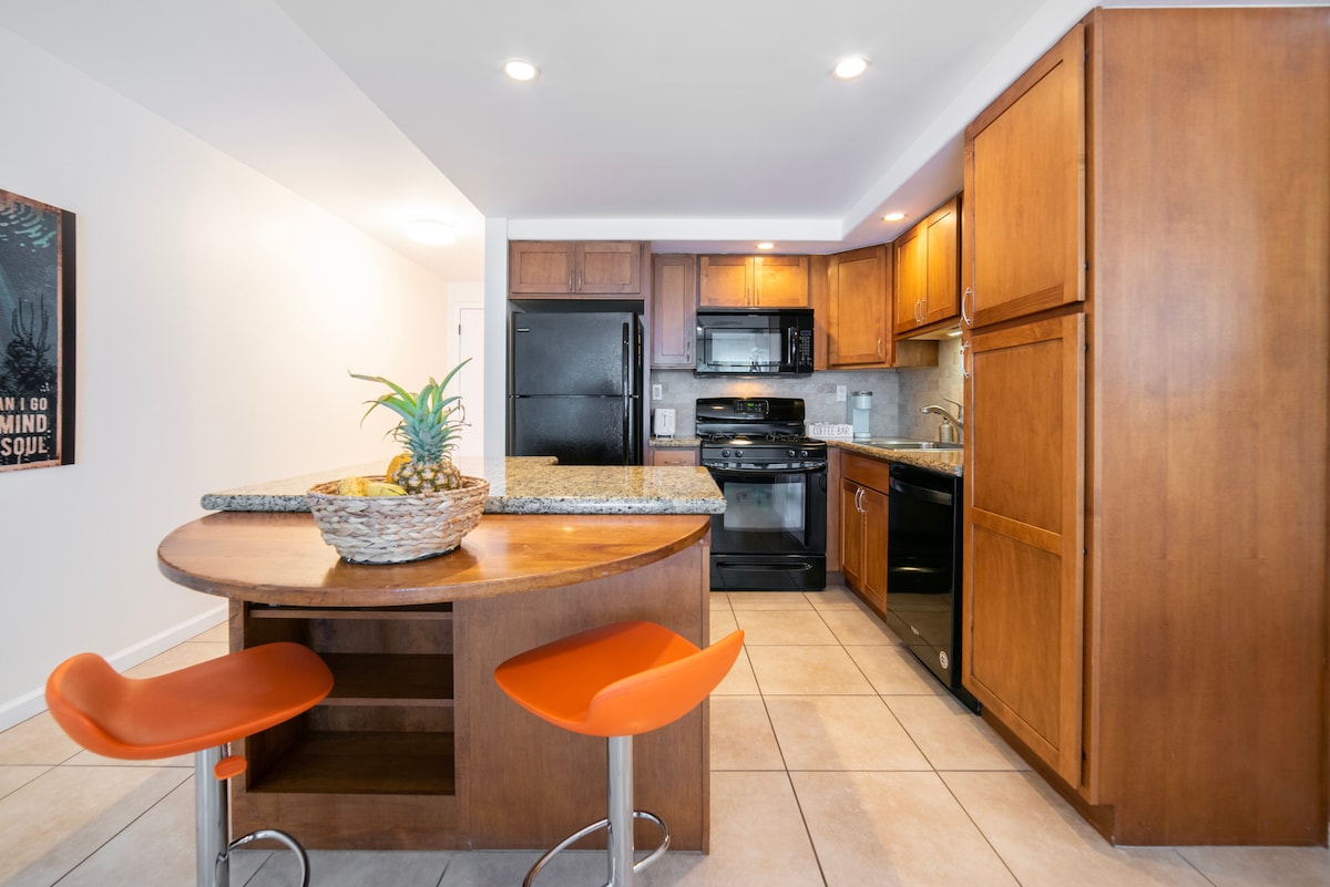 Ground-floor, bottom corner unit across from Cove Beach — close to beach sunset, surf, food trucks and local stores. The only unit with a tandem parking stall right next to your wall and back deck entrance. Step out of your car, walk straight in to your smart lock security door on your own back deck. Fully upgraded with fast Wi-Fi, two AC units, new appliances and a lava rock shower with hot/strong pressure. Sleeps 4 with a master + studio, beach gear, well-stocked kitchen and fresh linens.