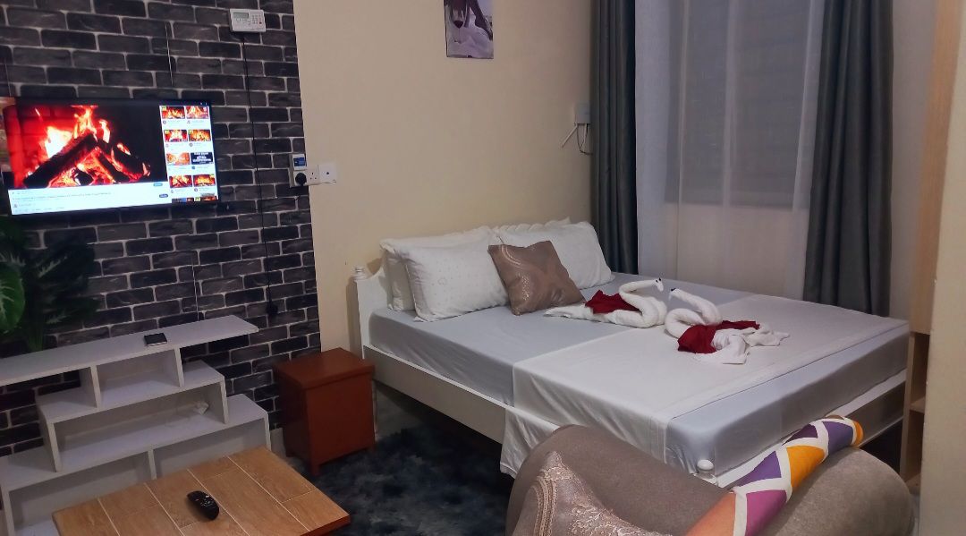 A cozy serviced studio apartment (Bamburi) furnished *Suitable for 2 adults and 1 child or 3 adults, furnished with a queen size bed and a single bed *Daily cleaning included *Dining table with four chairs, sofa, coffee table *AC *TV *Lock up safe *Balcony-two chairs, coffee table *Kitchen - fridge, microwave, kettle, coffee maker, toaster, crockery, cutlery *Access to amenities - pool, kids play area, beach bar, restaurant, gym, beach, laundry *21 km from Moi Int airport *26km from SGR Mombasa