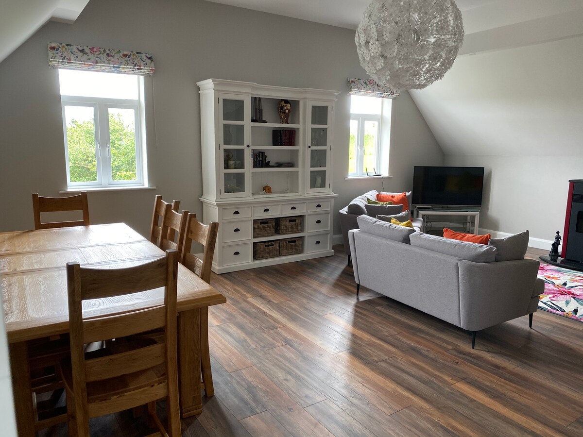 This modern, luxurious cottage is truly special. It is located in the Tawnawully mountains by Lough Eske. It is set on 12 acres with a river running through it and a tumbling waterfall right by the cottage. Only 15 minutes drive to Donegal town, which has some really nice restaurants and bars. There is a castle to explore in the town and a wonderful craft village with a very good cafe. Ten minutes drive to Harveys Point and twelve minutes from Lough Eske castle, both reputable 5 * hotels.