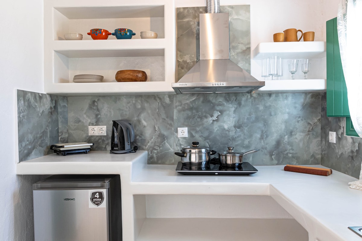 A unique aesthetic apartment with a beautiful private patio and lots of art touches, located in a picturesque neighbourhood in the heart of Naxos Town that can host up to 5 guests. Located 10' on foot from the Port, 1'-2' from the Market and other places of interest (castle, museums, etc) and entertainment (bars, restaurants, etc). If you travel without a car, no worries; the closest bus station to the most popular beaches and villages is at 3' on foot. Free parking space at 3' on foot!