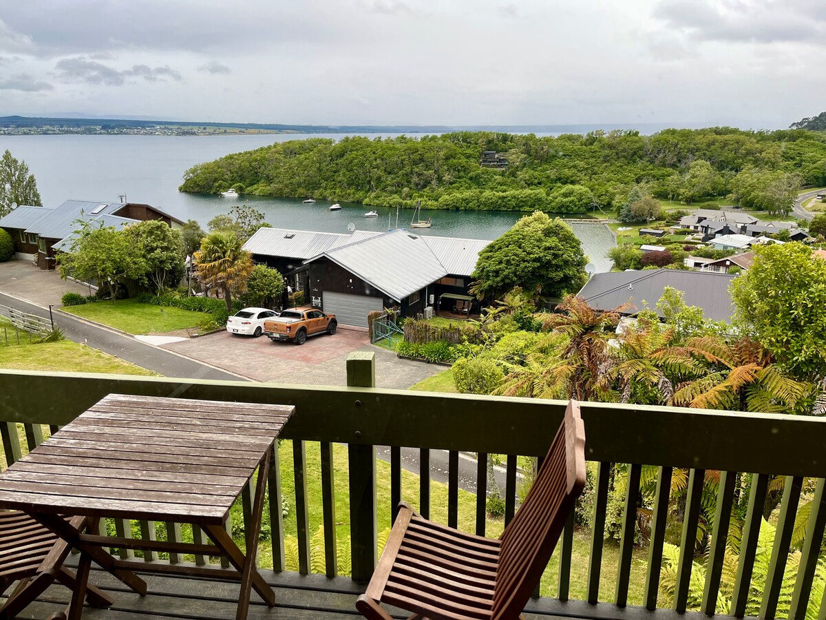 New studio unit nestled among the trees. Spectacular views across lake Taupo and Kaimanawa mountain ranges. Settle in for a cozy weekend away. Ammenities available - heated lap swimming pool, spa, Gym, sauna and tennis court. Situated within a gated community. Gate code access. Driveway is shared with the house at the front of the property. Note: Construction in the area & next door during weekday work hours.