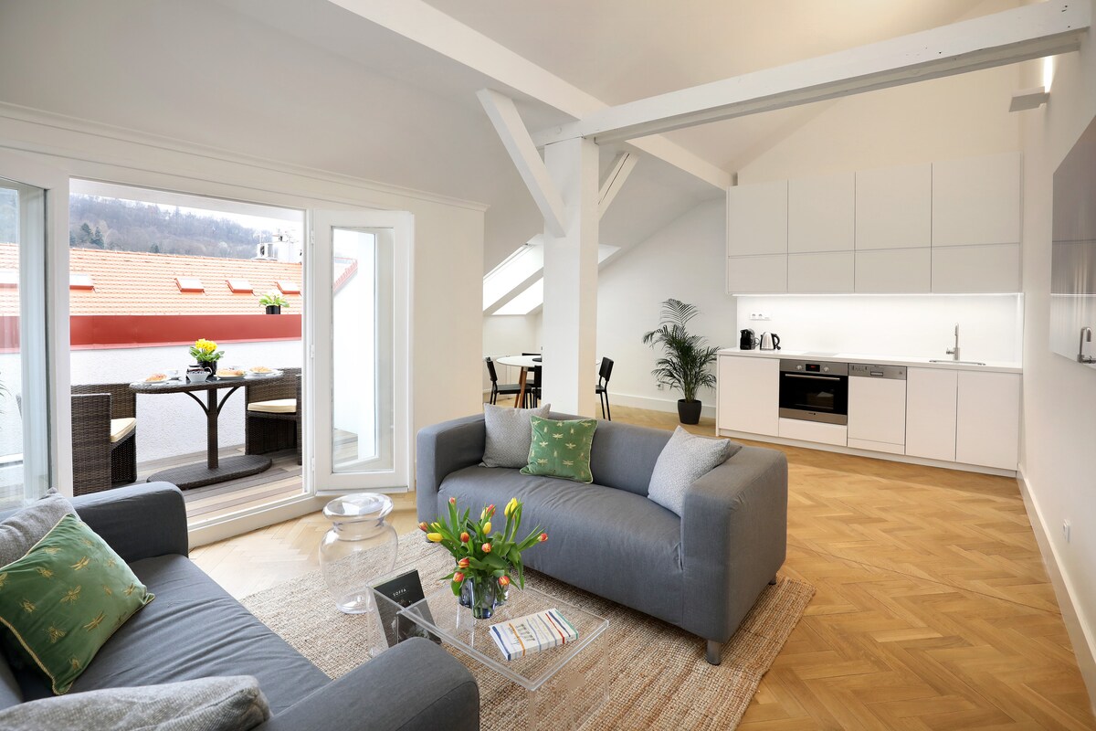 Beautiful newly renovated 1 bedroom apartment with breathtaking views of Prague Castle from a private roof top terrace|great location in the heart of Middle Europe's most dynamic and mystical city! The Apartment has a new custom cook's kitchen with all leading brand appliances, an open space living room with TV|cable, bathroom with shower, stocked with towels, basic vanities and hair dryer. The Bedroom is very bright with a custom made hard wood bed that includes a blissful sleep..
