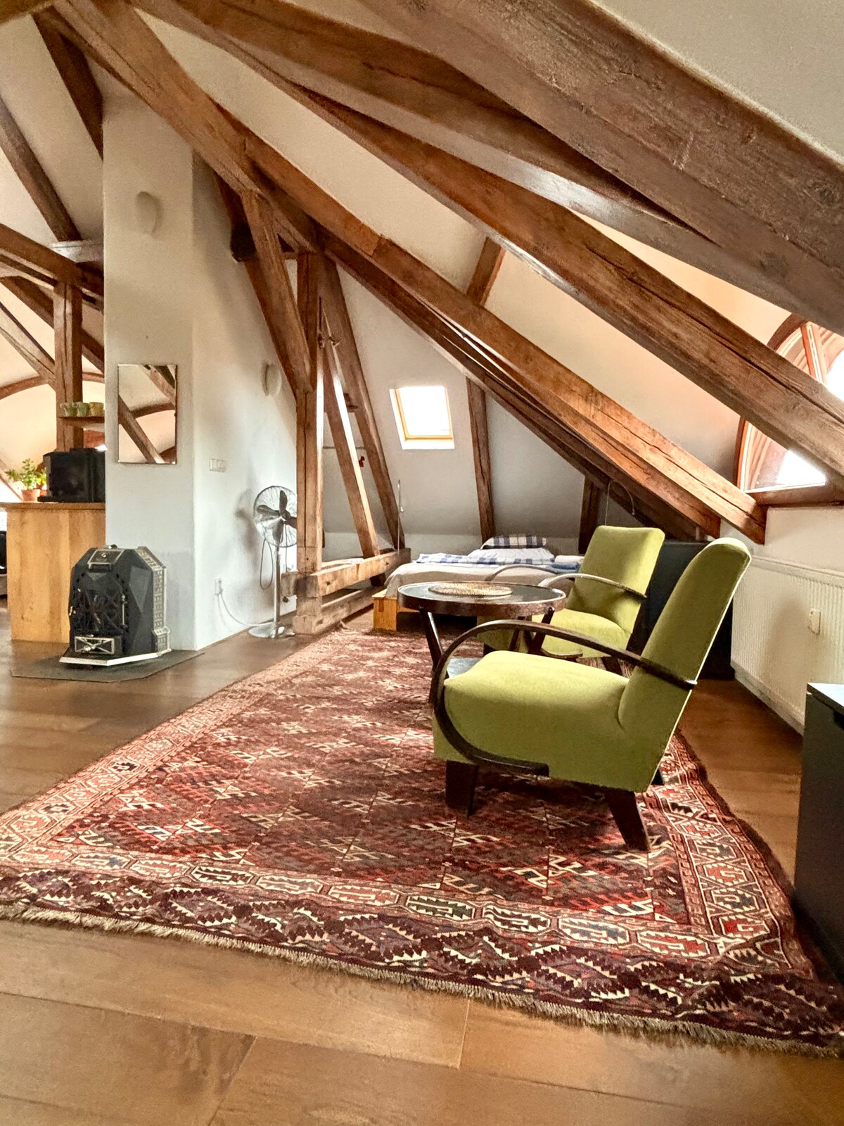 Discover a spacious apartment perfectly located near the Charles Bridge, with various tram lines just around the corner, and nestled between beautiful parks on one side and a stunning riverside with island access on the other. This ideal Airbnb spot is surrounded by amazing local businesses that will captivate you. Learn more about them in our guidebook.
